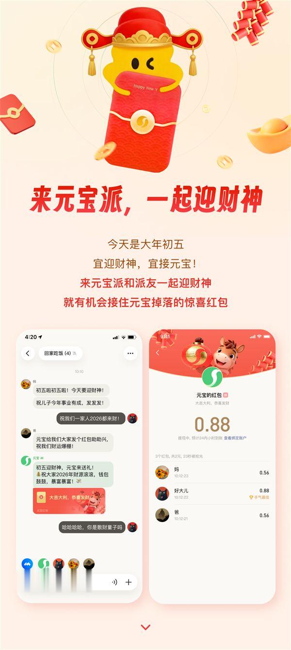 在支付宝之后,腾讯元宝也宣布发放迎财神红包,而且完全不需要复杂操作,父母长辈也能轻松领。