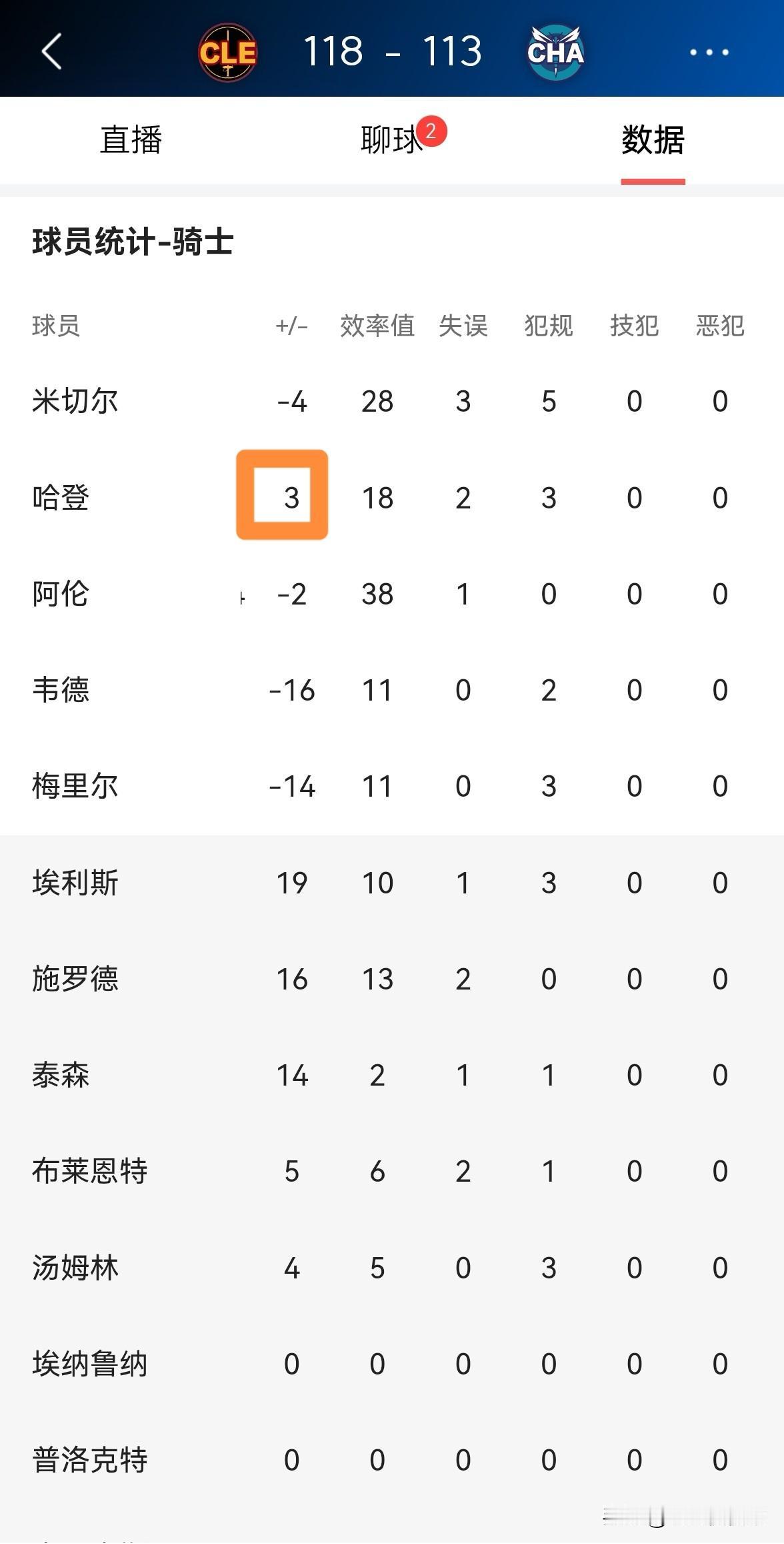 骑士巨星哈登真是太不同寻常了!在今天骑士客场以118:113力克黄蜂的比赛中,哈登的场上正负值是首发阵容里唯一的正值。 全场比赛下来,哈登首发出战34分钟,投篮14中6,其中三分球3中2、罚球4中4砍下18分4篮板8助攻1抢断,他的场上正负值为+3。 值得一提的是,哈登的场上正负值是球队首发阵容里唯一的正值,这足以证明哈登的不同寻常。