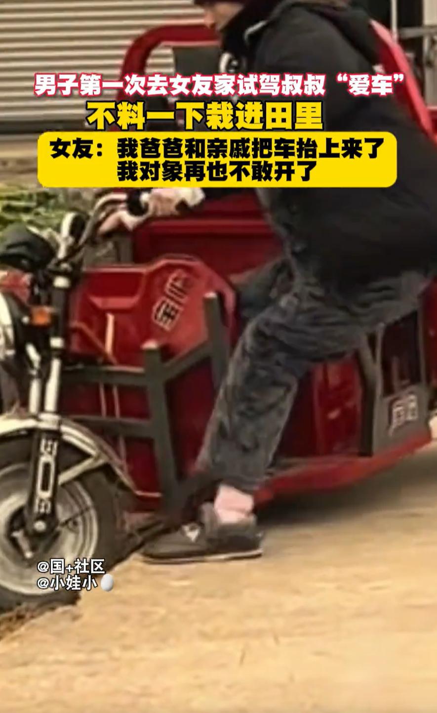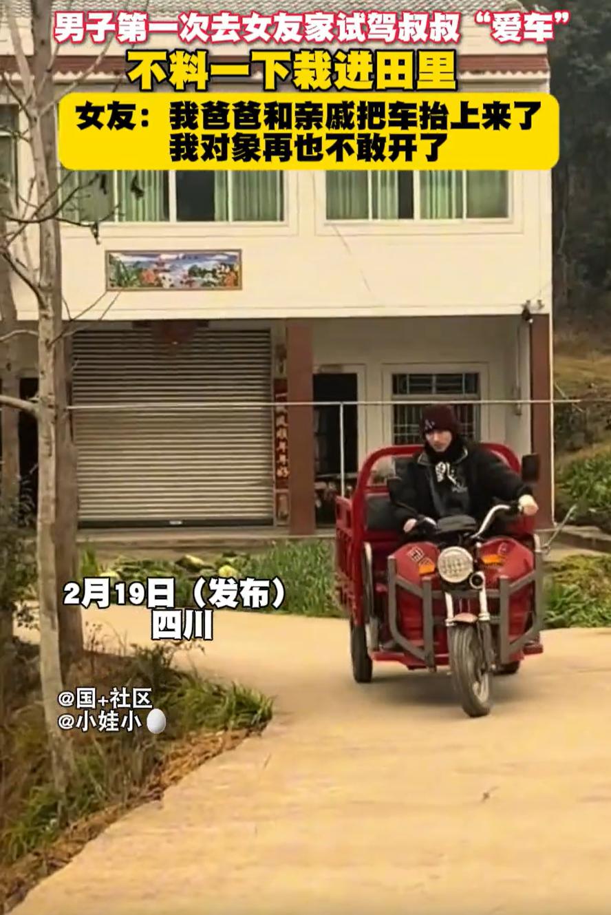 四川,男子第一次去女友家过年,为了能更快融入家里,就试驾了未来老丈人的三轮车,没想到却惹了大祸,刚骑上就栽进了旁边的田沟里,最后还是女友爸爸和亲戚一起给拉出来的。网友:这在老话来讲叫“毛头女婿” 小伙子第一次上门,心里肯定多少有点忐忑,想着怎么才能快速融入这个家。正好看到院子里停着老丈人的三轮车,也就是咱们常说的三蹦子 他可能琢磨着,这玩意儿跟汽车差不多,自己好歹也是个有驾照的老司机,开个三轮还不是手拿把掐?正好借这个机会,给老丈人留个好印象,显得自己啥都能干 于是,他信心满满地坐了上去。结果呢,理想很丰满,现实很骨感。这看起来简单的三蹦子,一上手就完全不是那么回事儿 本来想走直线,车头却像中了邪似的,一个劲儿往旁边拐。小伙子当时就慌了,脑子里一片空白,刹车在哪儿都忘了找。情急之下,他想起了小时候骑自行车的绝招,用脚刹 可这是三轮车啊,不是自行车。他这一脚伸出去,不但没刹住车,反而失去了平衡,连人带车,结结实实地栽进了路边的田沟里 好在人没有受伤,女友介绍,后来爸爸和亲戚一起把车给抬上来,而男朋友也表示以后再也不敢开了 有网友说:这三蹦子确实要有点技术,有位女同事四轮都开的很溜,结果也把三蹦子给开到田里了 还有网友说:不要以为你会开四轮车,你就会开这个三轮车我当年给老爸买的这个三轮车,是我教他的,现在他开的比我溜!他能拉500斤纸皮去我们县城!我只敢开个空车,在我们村里溜 其实咱们常说,术业有专攻,开车这事儿还真不是一通百通。开惯了四轮汽车的人,猛地一上手三轮车,还真不一定能适应 汽车是方向盘控制方向,四平八稳,三轮车尤其是那种把式的,全靠身体重心和手把的配合,稍微一偏就可能翻车。这跟技术好坏没关系,纯粹是没掌握那套操作逻辑 更重要的是,这事儿也折射出很多新女婿上门时的普遍心态。总想着干点什么,证明自己,博得老丈人一家的认可。有这份心当然是好的,但也得量力而行。有时候,过于想表现,反而容易弄巧成拙