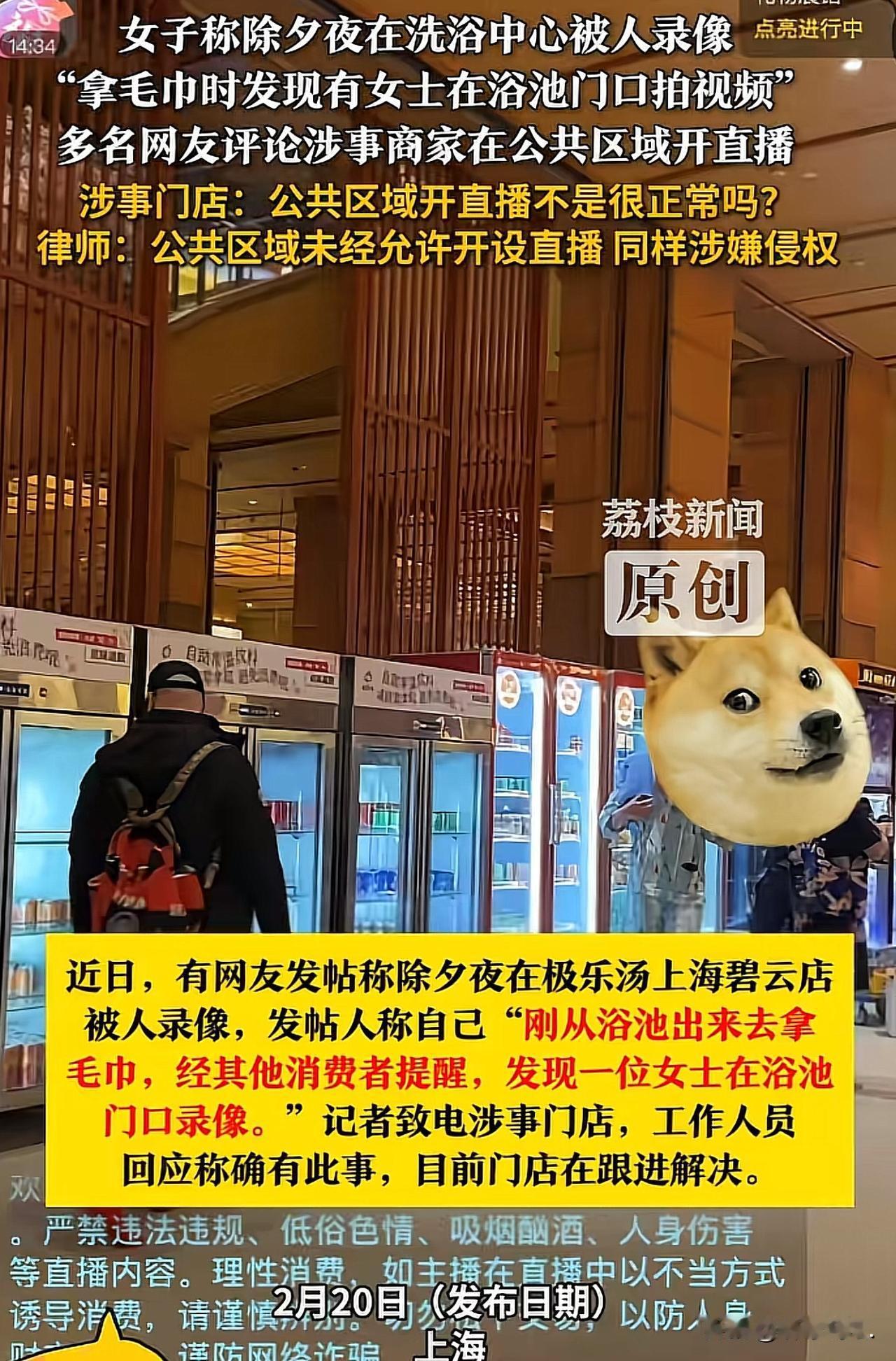 “太过分了!”上海,女子在浴池洗完澡,刚走出浴池去取毛巾,就有顾客提醒她,说有人在拍她,女子吓坏了,赶紧去找对方理论,这才发现对方是洗浴中心的工作人员。对方表示:这很正常的啊!女子一气之下报了警,目前,警方已经介入调查。 除夕夜,上海的一位女士却在极乐汤碧云店,遭遇了一件让她气愤不已的事情。 当晚,这位女士和家人一同来到极乐汤洗浴,想着卸下一年的疲惫,好好享受片刻的惬意。 泡完温暖的浴池后,她起身准备去拿干净毛巾,整个人还处于放松的状态,丝毫没有察觉到危险正在靠近。 就在她迈步走出浴池的瞬间,旁边一位好心的消费者悄悄拉了拉她,神色慌张地提醒:有人在拍你! 女士心头猛地一紧,顺着消费者示意的方向看去,只见一位陌生女子正站在浴池门口,举着手机对准自己的方向,屏幕上清晰地显示着录像界面。 那一刻,女士只觉得浑身血液都冲上了头顶,又惊又怒又羞耻,她刚从浴池出来,衣着单薄,状态私密,就这样毫无防备地被人录进了视频里,一种被侵犯、被窥视的不适感瞬间包裹了她。 她立刻上前制止对方拍摄,愤怒地质问对方为何私自录像,可对方说自己在直播,并无不妥行为。 女士担心视频被传播出去,更担心自己的隐私被肆意泄露,满心都是委屈与不安。 一气之下,报了警。 随后,将自己的遭遇发布到了网上,让网友给评评理。 不少曾经去过极乐汤门店的消费者纷纷留言吐槽,大家表示,这并非个例,极乐汤多个门店都存在在公共区域随意开直播的情况,镜头随意扫过顾客,很多人穿着浴衣、素颜放松的样子被全程直播,却从未有人提前征求过顾客的同意。 大家纷纷质疑:洗浴场所的公共区域,难道就可以无视顾客隐私,随意拍摄直播吗?无数消费者都曾有过和这位女士一样的不适与愤怒,却没想到自己的隐私诉求,在商家眼里竟一文不值。 记者随后致电极乐汤上海碧云店,就此事进行核实。 门店工作人员承认确有偷拍一事,也表示当事人现场已报警,门店正在协助警方处理、跟进解决。 可当记者提及网友集中反映的公共区域开直播侵犯隐私的问题时,这位工作人员的态度却让人瞠目结舌,不仅没有丝毫愧疚与重视,反而满不在乎地反问记者:“那不是很正常吗?” 本以为商家会重视顾客隐私,给出合理的解释与整改态度,没想到商家竟将随意拍摄、直播的侵权行为,视作理所应当。 《民法典》第1032条规定:自然人享有隐私权。任何组织或者个人不得以刺探、侵扰、泄露、公开等方式侵害他人的隐私权。隐私是自然人的私人生活安宁和不愿为他人知晓的私密空间、私密活动、私密信息。 浴池、洗浴区门口属于顾客具有合理隐私期待的区域,即便商家称之为“公共区域”,也不等于可以随意拍摄、直播。 未经本人同意,录制他人私密状态并传播,已经构成隐私权、肖像权侵权;商家未尽到管理与劝阻义务,同样需要承担相应法律责任。 目前,涉事门店仍在处理此事,但无数消费者都在等待一个真正有诚意的道歉,和一个切实保护隐私的整改方案。