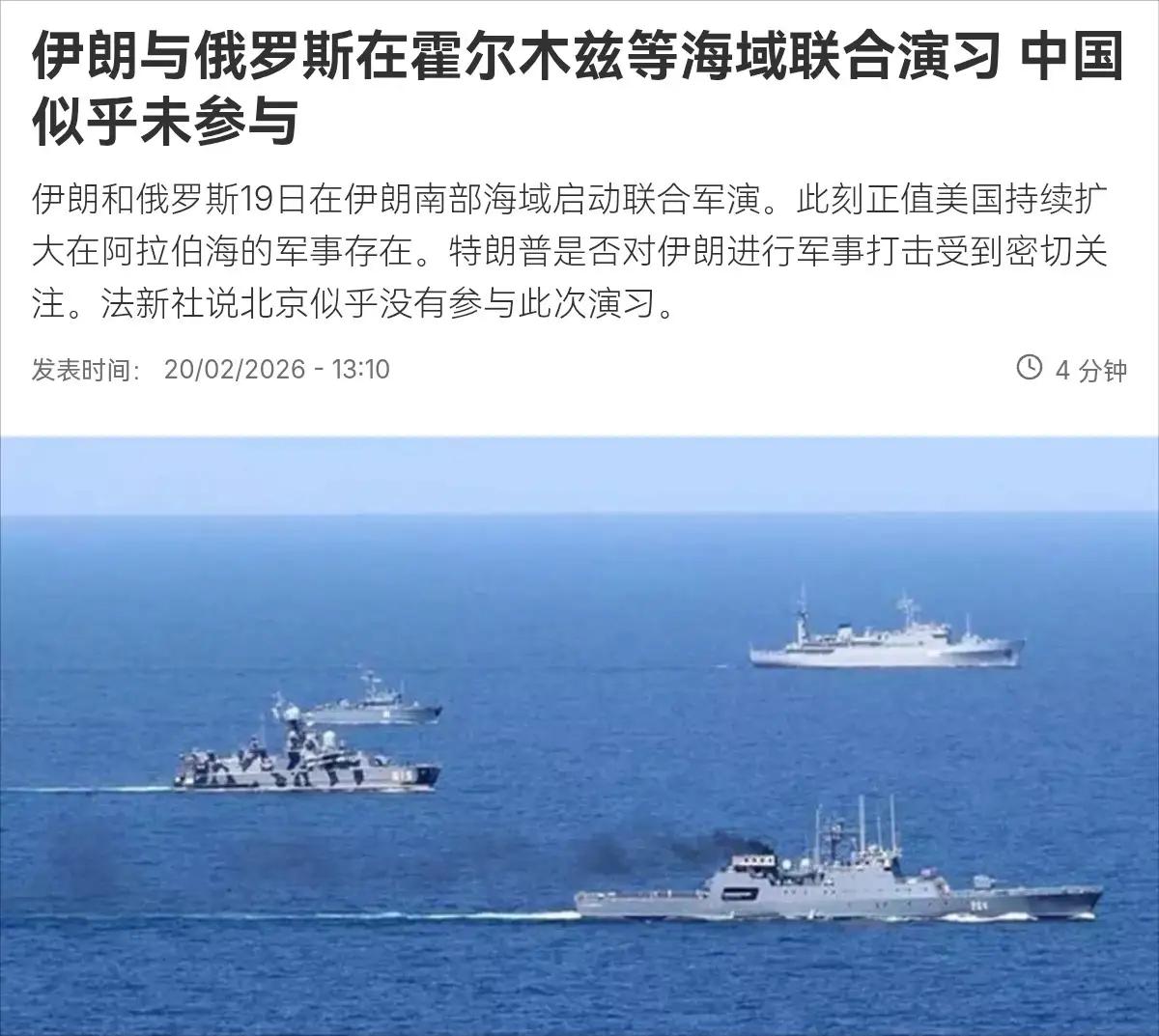 这一次军演,中国没有选择参加,中国的态度,伊朗也到了该认真考虑的时候了!在伊朗总统佩泽什基安亲口抱怨中国的投资到位不如预期之后,外媒又曝光了一个消息!2月20日,外媒报道称,在美国持续扩大在阿拉伯海的军事存在之际,伊朗和俄罗斯19日在伊朗南部海域启动联合军演,伊朗海军少将马格苏德卢表示,此次演习的目的之一是“防止该地区出现任何单边行动”。 最近美国对伊朗的调门越来越高,特朗普政府直接甩出“10天最后通牒”,摆明了要逼伊朗让步。 与此同时,美军两艘航母带着一堆战机在阿拉伯海转悠,F-35隐身战机天天起飞,这架势跟“秀肌肉”差不多,就差把“不服就干”写在脸上了。 伊朗被逼得没办法,只能拉上俄罗斯搞军演。按原计划,这该是中俄伊三国一起演,结果中国没来,俄罗斯派来的还是艘轻型护卫舰,规模比往年小了一大截。 伊朗海军少将嘴上说“防止单边行动”,但明眼人都看得出来——这军演更像是给美国看的“警告信号”,可惜信号有点弱。 伊朗为啥这么急着搞军演?说白了,是想拉中俄当“挡箭牌”。 这话听着像撒娇,实则是急了,美国制裁让伊朗经济快撑不住了,急需中国这个“金主”输血。 但伊朗可能没想明白:中国和俄罗斯的“玩法”不一样。俄罗斯是“有仗就打”,中国是“闷声发财”。 中国这些年在中东修港口、建产业园,靠的是长期合作,不是靠军舰撑场面。伊朗想用军演把中俄绑上对抗美国的战车,中国自然不愿意蹚这浑水。 中国这次没派军舰,可不是怕美国。看看中国在南海的布局——岛礁建设、海军巡航,哪样不是稳扎稳打? 不派军舰参演,恰恰说明中国不想被伊朗当枪使。 现代国际竞争早不是比谁嗓门大、军舰多。中国在中东的策略是“经济搭台,政治唱戏”:修港口、铺铁路、卖石油,这些实打实的合作比军演更能赢得人心。 伊朗与其纠结中国军舰来没来,不如好好想想怎么把中伊合作的项目落地——毕竟,口袋里的钱比海上的炮舰更让人安心。 说到底,伊朗现在就像个被欺负的小孩,想找两个大哥帮忙撑腰。但中国这个“大哥”比较务实——不搞“兄弟义气”,只谈“生意合作”。 俄罗斯虽然愿意帮忙,但实力有限,只能凑个热闹。 美国现在就像个“校霸”,天天威胁伊朗,但真要动手也得掂量掂量。 伊朗与其指望别人,不如自己争气点:把经济搞上去,把军事实力提起来,到时候美国自然不敢随便欺负。 中国不派军舰,恰恰说明咱们有底气——不靠军演也能在中东站稳脚跟。毕竟,在这个现实的世界里,能给别人带来实际好处,比秀肌肉有用多了。 伊朗要是明白这个道理,早就该和中国好好谈合作了,而不是纠结军舰来没来。