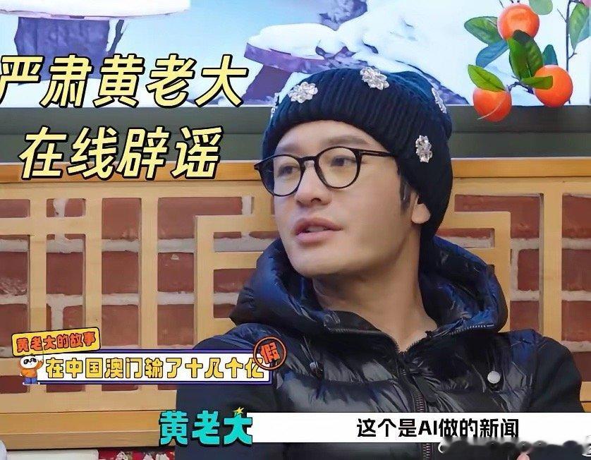 黄晓明回应在澳门输掉十几亿黄晓明:“我在中国澳门输了十几个亿。”黄晓明说完,旁边的小伙伴黄子韬和王鹤棣等人都一脸震惊,随后肯定的说这是假的。这是黄晓明和王鹤棣黄子韬等人在综艺节目玩真假故事,黄晓明主动说自己曾被造谣在中国澳门输了十几个亿。当时他正在拍戏,看到这个谣言以后,虽发了自己在剧组拍戏的照片和定位,但还是有些人相信了这个谣言,这让黄晓明很受伤。黄晓明解释其实这是别人用AI拼接造假的,但就是这种一看就是假的信息,居然还会有人相信,他既气愤又无奈。