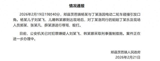 2026年2月19日19时40分,河南省平顶山市郏县茨芭镇杨某与丁某洛因电动二轮车碰撞引发口角。杨某儿子刘某飞、儿媳韩某娜到达现场后,对丁某洛同行的姐姐丁某乐及现场人员郭某、张某凡、薛某源进行辱骂、殴打。