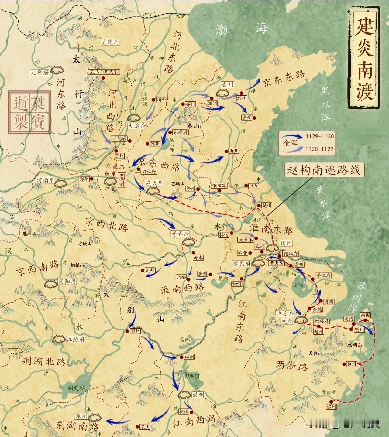 以前只知道东晋十六国时期有个衣冠南渡,没想到北宋灭亡时还有个建炎南渡,说实话赵构打仗的水平不怎么样,逃跑的本事倒是挺溜,硬是让他跑出了个南宋王朝,如果明朝的崇祯皇帝也像他一样能跑,而不是被文臣欺骗,无奈只能吊死在煤山上,说不定历史上会有一个南明的政权与清朝长期对峙。 历史地图