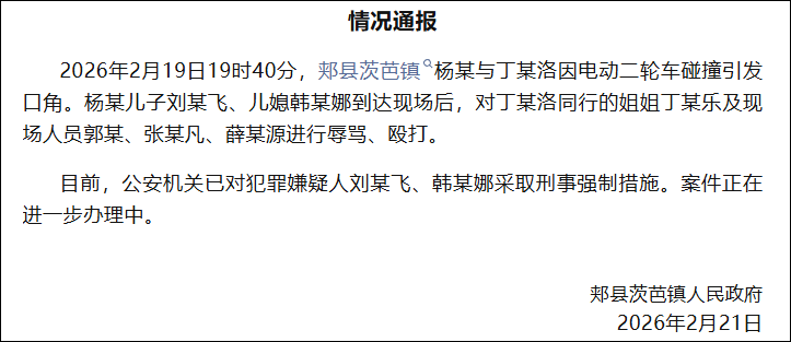 通报称,2月19日19时40分,郏县茨芭镇杨某与丁某洛因电动二轮车碰撞引发口角。杨某儿子刘某飞、儿媳韩某娜到达现场后,对丁某洛同行的姐姐丁某乐及现场人员郭某、张某凡、薛某源进行辱骂、殴打。