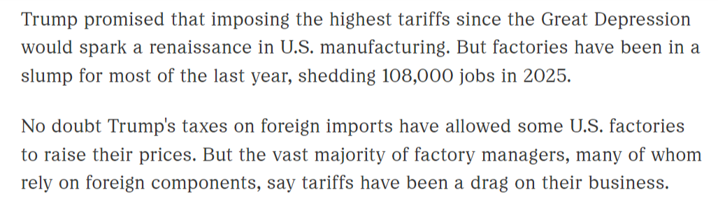 特朗普曾承诺,实施自1933年大萧条以来最高水平的关税将推动美国制造业的复兴。但过去一年大部分时间里,美国工厂一直处于低迷状态,2025年出现大量裁员。