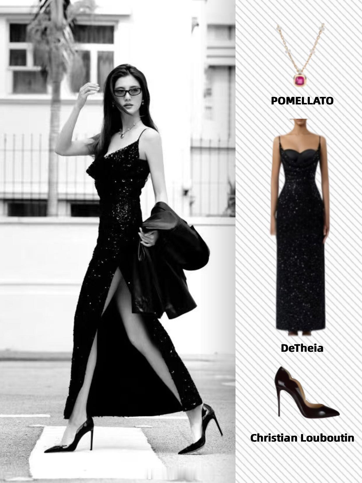 吴千语身穿黑色吊带亮片长裙搭配路铂廷高跟鞋参加线下活动,性感明艳的港姐范儿十足