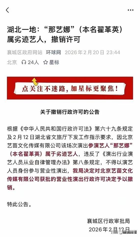 2月21日,娱乐圈里一整天都静悄悄,没想到突然传来一个负面消息,就在前一天,将本名翟革英的她列为劣迹艺人,撤销其襄阳演出的营业性许可,原定演出全面叫停。 那艺娜靠魔性神曲快速出圈,流量暴涨的同时,身份造假、舞台失信等问题持续发酵,公众信任早已透支,这次处罚是行业底线的必然回应。 文娱圈从不缺一夜爆红的神话,更不缺德不配位的翻车案例,靠虚假人设收割流量,终究躲不过规则与口碑的双重审判。 劣迹艺人的处置早已形成闭环,从平台封禁到演出叫停,从商业解约到行业禁入,每一步都在压缩失德艺人的生存空间。 主办方仓促报批、疏于审核,最终吞下许可被撤、演出泡汤的苦果,也给全行业提了醒,艺人准入必须先过德艺关。 流量可以制造,口碑无法伪装,公众人物拿着远超普通人的收益,就该扛起更重的责任,守住法律与道德的双重底线。 这次区域性处罚虽未全国封禁,但足以宣告其商演之路彻底堵死,其他城市绝不会为劣迹艺人开绿灯,演艺生涯基本终结。 行业净化不是一阵风,而是长期坚守,只有对失德行为零容忍,才能让真正有德有才的艺人站稳舞台,还行业一片清朗。 各位读者你们怎么看?欢迎在评论区讨论。