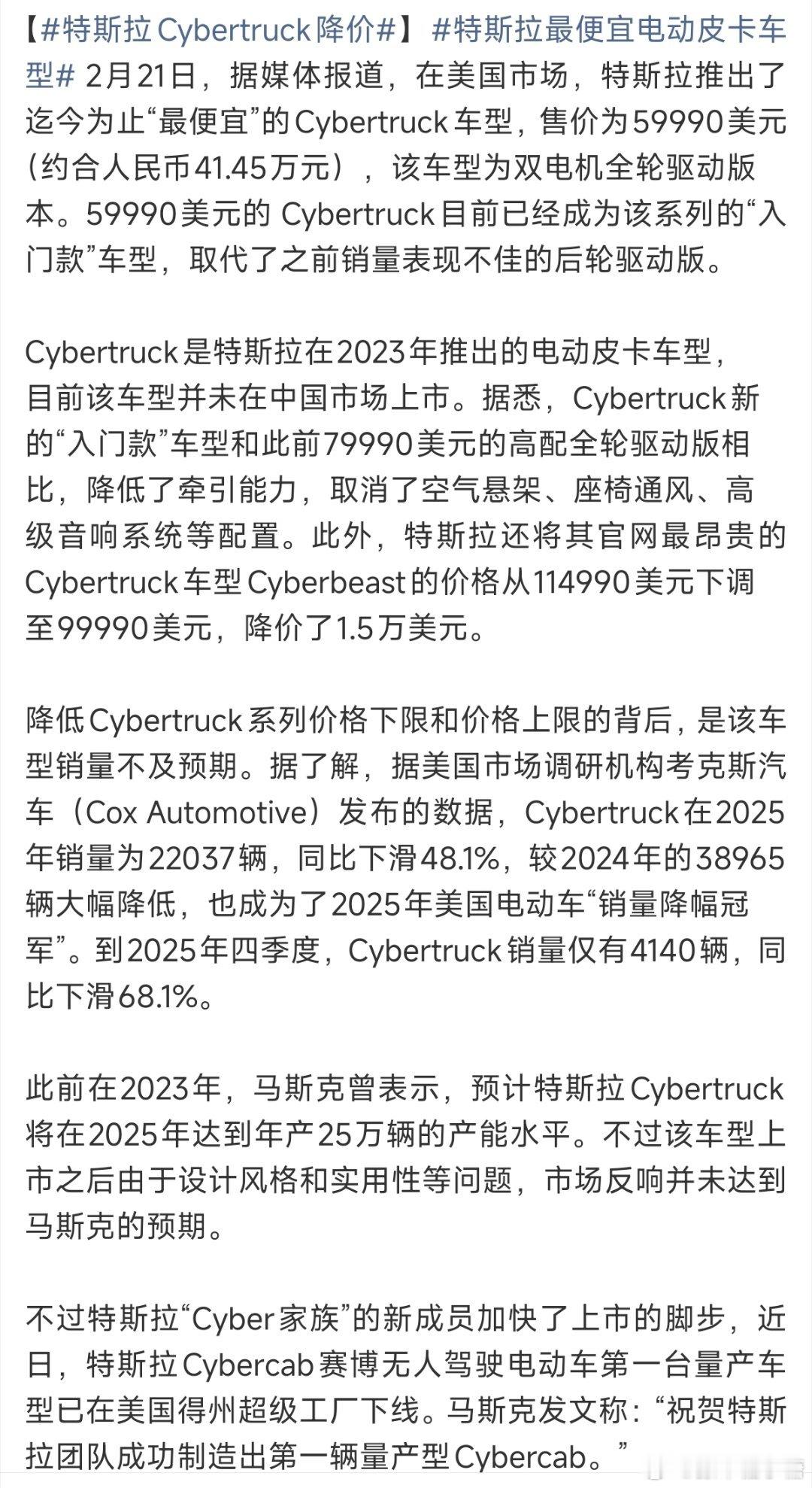 特斯拉Cybertruck降价大V聊车 特斯拉市场份额一降再降,所以当实际销量不