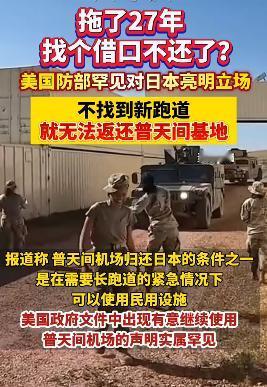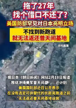 美国又开始耍流氓了。拖了27年,终于不装了。 美国国防部正式通知日本,如果不找到合适的可以建跑道的地方,普天间基地就不还了。 另外找合适跑道的地方这件事,美国国防部不管,由日本政府负责。 当地人抗议又能如何? 说实话,给你打声招呼还算给你面子,什么都不说就一直占着,你日本又能如何? 日本就是美国小妾,看看图一那副低眉顺眼的样子就知道了。 点右上角关注我,我们一起去看这个魔幻的世界