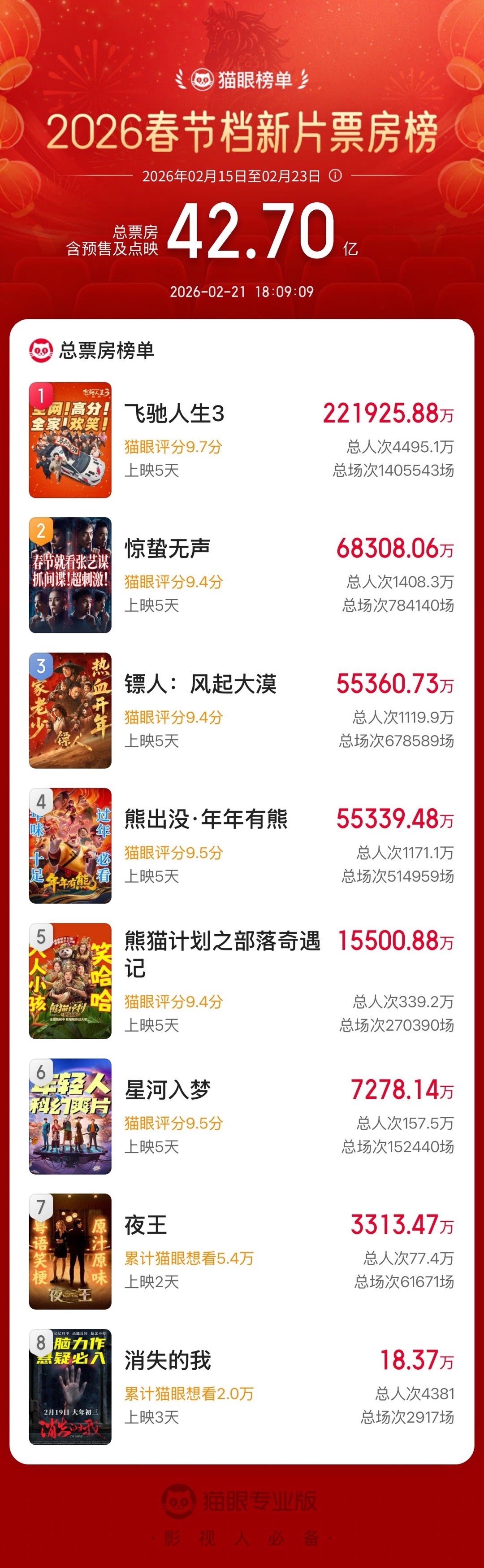 镖人春节档票房超熊出没 报!电影《镖人:风起大漠》总票房破5.52亿,超《熊出没·年年有熊》位列春节档票房榜第三!春节档马上有戏