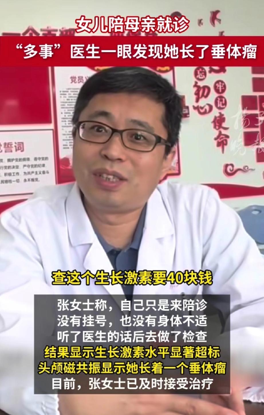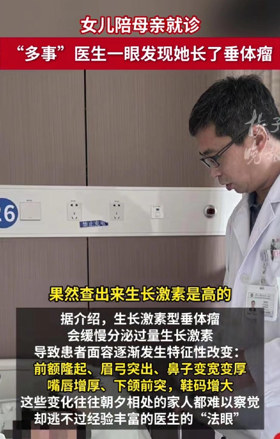 太牛了!江苏苏州, 一位女儿戴着口罩陪母亲去医院检查,母亲没啥事,医生却突然扭头对她说:“你要不要也查一下?我怀疑你脑子里长了东西。” 结果一查,脑子里真的长了个垂体瘤。医生说:查不出来,40块钱检查费我私人报销。 网友直呼:这才是真正的“火眼金睛”! 事情发生在苏州苏大附一院的神经外科诊室,张女士戴着口罩陪母亲来做术后复查,全程没挂号、没说话,就安静站在角落,脸只露出额头和眉骨。 接诊的刘建刚医生有26年神经外科经验,给老人检查完后,目光扫到张女士的眉骨,发现她眉弓凸起、额头轮廓偏宽,这是生长激素分泌过量的典型表现,凭经验立刻判断她大概率长了垂体瘤。 刘医生当即让张女士也做个检查,张女士当场就懵了,自己只是陪诊的,平时能吃能睡没一点不舒服,只觉得是医生想多开检查,压根不信。刘医生看她怀疑,直接放话:就查一项生长激素,只要40块,结果正常这钱我私人给你报销! 张女士拗不过医生的坚持,半信半疑去抽了血,结果发现生长激素指标超标7.2倍,随后做的核磁检查,确诊她大脑鞍区长了1.2厘米的生长激素型垂体瘤。 张女士这才恍然大悟,自己两年鞋码从38变40、手指变粗、脸型变宽,根本不是长胖变老,都是肿瘤惹的祸。之后她做了微创小手术,术后一周就顺利出院,激素水平也恢复了正常。 有人说:“这医生简直是火眼金睛,口罩遮了大半张脸,就看个眉骨都能发现问题,太厉害了!” “40块钱的小承诺,藏着最真的医者仁心,这样的‘多事’医生越多越好!” 咱谁去医院看病,不盼着遇到这样的医生?现在不少人看病都觉得是流水线,医生忙得顾不上多问一句,可刘医生不一样,他给主患者看诊时,还能留意到旁边的陪诊人,怕患者有顾虑,还愿意用自己的钱做承诺,这份细心和担当真的太难得了。 这颗垂体瘤特别会“藏”,变化慢到自己和家人都看不出来,张女士一直以为只是长胖,压根没往生病上想,要是没有刘医生的“多看一眼、多问一句”,拖到肿瘤变大压迫视神经,后果真的不敢想。 这份把患者放在心上、对生命负责的态度,比任何高超的技术都更打动人! 刘医生被人说“多事”,可这份“多事”,恰恰是最珍贵的医者仁心!他能一眼看出隐疾,不是靠运气,是26年临床经验的沉淀;他许下40元的承诺,不是赌约,是对患者的真心与担当。 真正的好医生,从来都不只是会看病,更有一颗愿意为患者多操一份心、多担一份责的初心。他没有做什么惊天动地的大事,只是用专业捕捉细节,用诚意化解顾虑,就为患者争取到了宝贵的治疗时间。