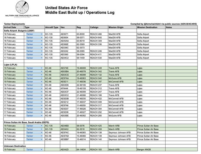 🔻自 1 月 15 日以来,从美国及日本基地途经欧洲至中央司令部责任区(CENTCOM AOR)的 C-17/C-5 运输机已执行至少 265 架次飞行。此外,自 2 月 16 日起,已有至少 58 架 KC-135 和 KC-46 加油机部署至欧洲多地——此数据不含执行"加冕行动"(Coronet operations)的加油机。🔻这相当于美国空军加油机整体机队近 15%的兵力:过去四日内,77 架 KC-46"飞马"加油机中至少有 18 架,以及 314 架 KC-135"同温层"加油机中至少有 40 架被部署至欧洲。🔻美国空军加油机目前已分别派驻拉日什、莫龙、罗塔、索非亚、干尼亚和苏尔坦亲王基地。它们似乎倾向于与同型号加油机共同部署,例如拉日什基地全部为 KC-46 型。以下是截至目前的详细部署清单,括号内为自 18 日以来的变动数量:🔹亚速尔群岛拉日什基地:15 架(+5 架)🔹索非亚机场,保加利亚:8🔹莫龙空军基地,西班牙:5(+5)🔹罗塔海军基地:15🔹苏达湾干尼亚:10🔻自 16 日起,又有额外加油机(不包括原有轮换部署的)被部署至沙特阿拉伯。🔹沙特阿拉伯苏尔坦亲王基地:5 架(+2 架)🔻本周,来自阿维亚诺、施庞达勒姆和麦肯泰尔空军基地的 F-16 战机,以及来自英国莱肯希思皇家空军基地的"LN"代号 F-15E 攻击鹰战机和来自兰利空军基地的"FF"代号 F-22 猛禽战机,均已转移至美国中央司令部责任区。🔻六架 E-3 预警机已飞越拉姆施泰因和英国米尔登霍尔空军基地,随行的还有至少两架 E-11A 战场通信节点机及一架 U-2 侦察机。🔻这还不包括本周前已部署在该区域的飞机数量。🔻自上次更新以来,已有约 36 架 C-17 和 C-5 运输机抵达中东地区,另有 6 架陆军相关及 6 架空军相关的飞行任务仍在进行中。这使得总飞行架次达到约 265 架。🔻最后一周的飞行活动主要为大量战机的部署提供支持,包括从德国斯潘达勒姆空军基地直飞的 9 架、从英国拉肯希斯皇家空军基地起飞的 6 架、从麦克恩泰尔基地起飞的 4 架、从罗斯福路基地起飞的 10 架,以及从阿维亚诺基地起飞的 3 架。🔻理论上,美国现在已具备对伊朗发动打击的条件。目前仅剩少数限制因素可能导致他们暂缓行动:🔹- 轰炸机基地部署。美国空军加油机编队的位置使其可能支持从美国本土或(我猜想更可能是)费尔福德皇家空军基地起飞的轰炸机。如果英国政府拒绝使用该基地的报道属实,这将严重限制美国能执行的轰炸机架次。在费尔福德基地部署可实现每夜或隔夜行动,而从美国本土往返的难度更大,尤其若仅使用 B-2 轰炸机。🔹- F-22 部署。来自兰利空军基地的 12 架 F-22"猛禽"战斗机目前驻留在英国莱肯希思皇家空军基地。第二批 6 架编队的抵达时间有所延迟,直至周四夜间才全部到位。考虑到机组人员休整时间,最早可部署日期为 2 月 21 日。这可能成为影响美国决策的关键因素,美方或将等待这批战机到位。🔹- "杰拉尔德·R·福特"号航母。该航母已被观测到准备穿越直布罗陀海峡,这意味着其至少还需 4 天才能抵达东地中海区域。🔻综合以上三点因素,armchair admiral认为美国最早可能对伊朗发动攻击的时间是 2 月 27 日(周五)。特朗普自嘲是历史上最傻的总统美军力量被曝正快速集结