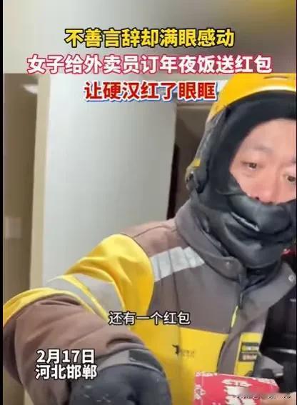 河北邯郸,大过年的,外卖小哥送了一份外卖给女子,女子却不要,还给他递了一个红包,女子说:“这是给你订的年夜饭!”外卖小哥看着手中的外卖,又看着女子递过来的红包,瞬间热泪盈眶了。 男子是一名外卖小哥,为了生计,他不管风吹日晒,都穿梭在大街小巷上,他忙忙碌碌,日复一日,给大家送外卖。 工作虽辛苦,但这份工作解决了他一家老小的温饱,他很珍惜这份工作。 为了多一份收入,大过年的,他知道点外卖的人特别多,他就舍不得休息,依然早出晚归,奔波在路上。 这是他的日常,也是他的工作,忙碌又平淡,丝毫没有给他的生活带来半点涟漪。 但一份特殊的年夜饭,一个暖意的小红包,却温暖了他的这个春节。 当时他接到一个单,这个单就如平常时所接的单一样,男子也没有觉得有什么不妥,这份外卖也没有特别标注,更没说要赶时间。 不过他接了单之后,也是有送单时间限制的,即使没有催促,他还是按时按点去送餐。 他在规定的时间里,送到了订餐地点,他敲响了女子家的门。 让他惊讶的一幕出现了,当他把外卖递给女子,奇怪的是女子居然不要这份外卖。 她说:“这是给你的年夜饭,里面是饺子啥的。”说完,女子还拿出一个红包给男子。 男子看到女子递过来的红包,他愣了一下,女子又对他说出这样的暖心话,他瞬间感到一股暖流,涌入他的心间,眼眶也瞬间湿润了。 他做外卖小哥那么久,很少遇到这样暖心的事情。 大过年的,其实送外卖就是他的工作,突然有人如此这么把他的工作放在心上,他真的感动了。 选择送外卖这份工作,对于男子来说,或许就是一份迫不得已的选择,或许是他没有一技之长,或许是他没有学历,或许是他没有多大的能力。 但他是家中的顶梁柱,他要养家糊口,他需要挣钱,需要顾家,所以只能选择这份又能顾家,又能自由支配时间的工作。 这份工作,在他人看来,这不过就是一份糊口的工作,没有多大的出息,别人对他也不会高看一眼。 他选择这份工作,内心也会有些不甘心,他也希望得到别人的尊重。 而这一份特殊的外卖,女子送给他的年夜饭,还有那一个红包,这不是一份普通的年夜饭,那红包也不是普通的红包,而是对他的工作的肯定和尊重。 正是这份尊重,让他感受到了自己工作的意义,让他在忙碌的奔波中,感受到了来自他人的温暖,也感受到了新年的年味。 他堂堂七尺男儿,看到这份特殊的年夜饭和这个特殊的红包,他收下了,他收下了这份被别人的重视的心意,也收下了这份尊重。 他感激女子,转身离去的瞬间,泪水不争气地涌出来了,他不善言辞,只能将千言万语的感激,融入谢谢两个字当中。 男子之所以被这一份年夜饭和一个红包感动了,或许他正是因为生活的各种压力,选择春节这个时间段送外卖,他牺牲休息的时间,无非就是想多一点收入。 看到别人团团圆圆的样子,他又看着自己东奔西跑的样子,内心难免失落。 在这个时候收到女子的红包和年夜饭,这份暖意确实让人感动。 女子的暖心举动,不过是一份善举,是道义上的赠与,不需要他人返还的。 《民法典》第658条规定:赠与人在赠与财产的权利转移之前可以撤销赠与。经过公证的赠与合同或者依法不得撤销的具有救灾、扶贫、助残等公益、道德义务性质的赠与合同,不适用前款规定。 当然女子只是随意把自己的善意传递出去,她肯定不需要别人返还的,而她的善意正温暖着男子。 那么你对此事有何想说的?