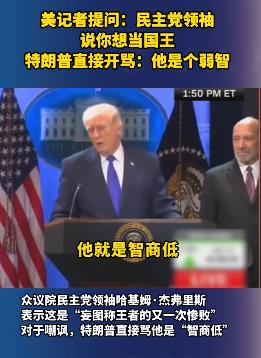笑死我了。税宗天天整活儿给全世界带来欢乐。 这次是美国记者挑事。 说民主党领袖说你想当国王。 税宗直接回怼,也不管这个话是不是别人说的,反正他就直接开喷。 “他就是智商低” 是不是顿时让你回到了学生时代? 想起你的那些中二同学,今天这个是傻子,明天那个是弱智。 太好玩了,感觉白宫就是一个大号的幼儿园。 莱维特是不是那个保育阿姨啊? 她看上去真的很像。[笑哭] 点右上角关注我,我们一起去看这个魔幻的世界