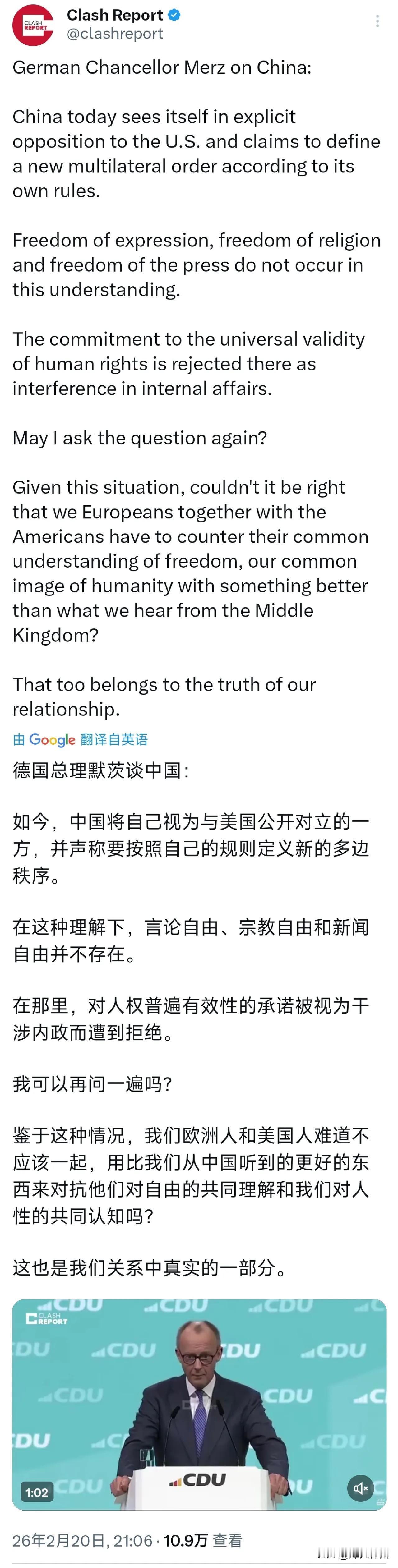 德国总理默茨昨晚(北京时间2月20日晚)发表讲话谈到了中国:“如今,中国将自己视为与美国公开对立的一方,并声称要按照自己的规则定义新的多边秩序。 在这种理解下,言论自由,宗教自由和新闻自由并不存在。在那里,对人权普遍有效性的承诺被视为干涉内政而遭到拒绝。 我可以再问一遍吗?鉴于这种情况,我们欧洲人和美国人难道不应该一起,用比我们从中国听到的更好的东西来对抗他们对自由的共同理解和我们对人性的共同认知吗?这也是我们关系中真实的一部分。” 评几句: 德国总理默茨近期就中国相关事务发表言论,试图用单一标准评判各国发展道路,这种充满偏见与傲慢的做法,早已不符合当今世界的发展潮流。 世界文明本就多元多样,各国历史、文化、国情差异巨大,从来没有放之四海而皆准的制度模式。多边秩序的核心是尊重主权、平等相待,而不是少数国家居高临下定义规则、干涉他国内政。 中国的道路由中国人民自主选择,中国的发展成就世界有目共睹,这不是外部几句片面指责就能否定的。把自身价值观包装成“唯一真理”,拉帮结派制造对立,只会破坏国际合作大局。 时代早已变了,动辄说教、挥舞价值观大棒的做法行不通。相互尊重、不干涉内政,才是国与国交往的基本准则,也是大国应有的格局与担当。