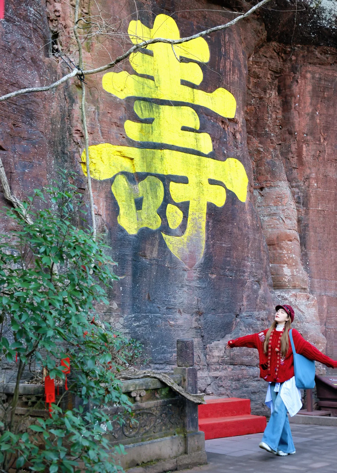 镶嵌于山体的红色楼体,旁边还有唐伯虎真迹碑刻