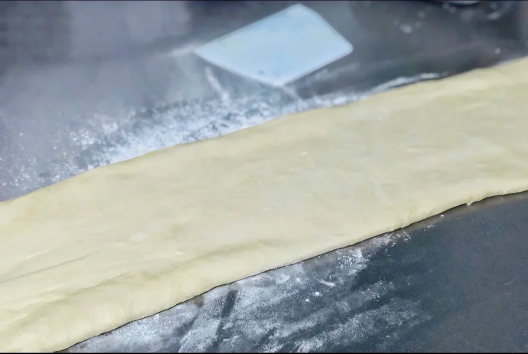 6.隔天早上从冰箱拿出来之后放入常温下回温30分钟,不要揉面,案板上撒上一些干面,轻轻边擀边拉成长条状。