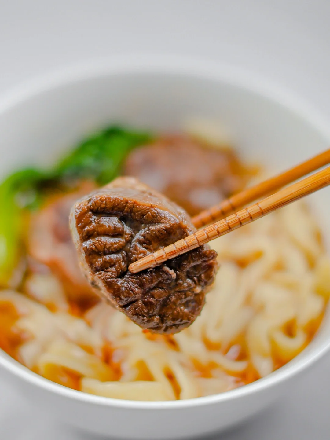 9.准备一锅热水,面条和青菜放入,煮熟后捞出放入碗中,浇上红烧牛肉的高汤,放上牛肉和牛筋即可。
