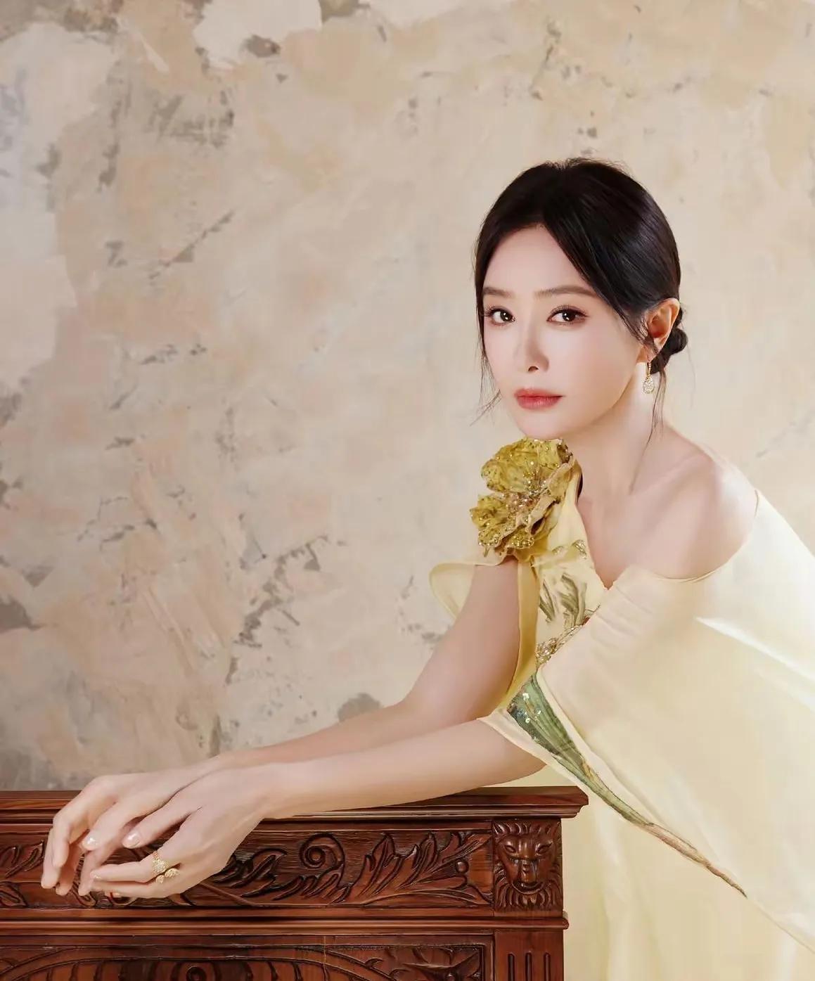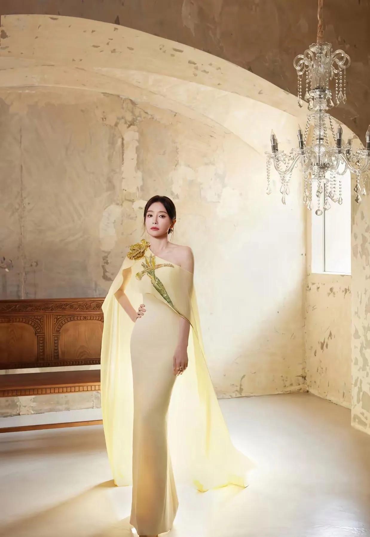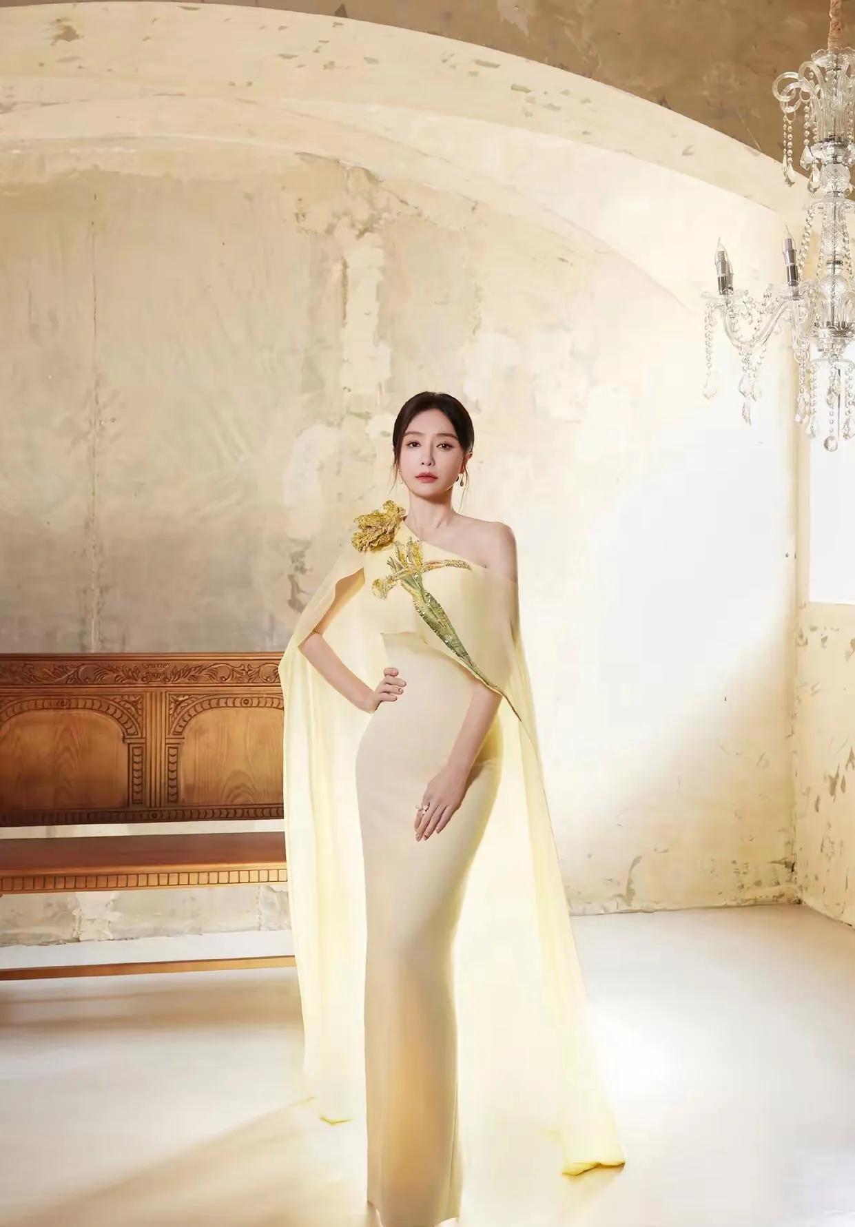 秦岚春晚造型美出新高度!✨ 一袭淡黄露肩长裙,搭配飘逸纱质披风,肩部的金色刺绣花卉精致又大气,完美勾勒出东方韵味。 收腰鱼尾设计尽显曼妙曲线,温柔又不失气场,这才是中式美学的正确打开方式! 秦岚春晚造型 东方美学