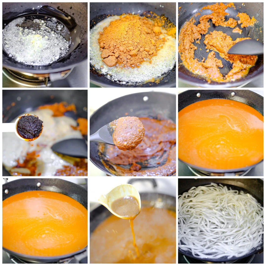 ⭐️3.锅中加入适量的食用油,加入姜蒜末炒香,加入沙茶粉,小火慢炒出香味,加入花生酱、酱油、食盐、白糖、继续翻炒均匀。