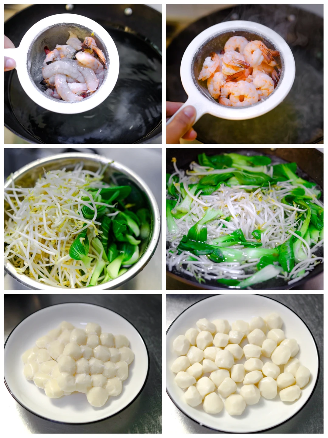 ⭐️2.把虾、鱼丸、海蛎子、鱿鱼用热水汆烫好,青菜绿豆芽同样也是如此。