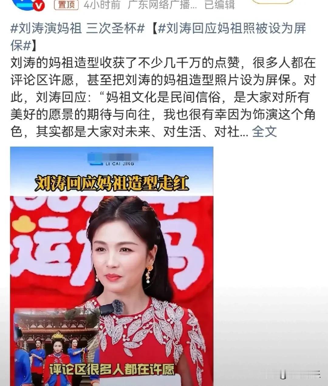 刘涛,火上热搜! 最近打开手机,估计不少人都吓了一跳——怎么朋友圈里突然都在用刘涛的照片当壁纸?乍一看还以为是粉丝团建,仔细一瞅,原来是咱们的“妈祖”本尊“住”进大家的手机里了。 这事火得挺有意思。刘涛那几张在妈祖诞辰上的造型照,端庄慈悲,特别是去年穿着紫霞华裳献寿桃的那一幕,被网友截图下来,越看越有味道,干脆直接设成了屏保,评论区还成了“许愿池”。 面对这波突如其来的热度,刘涛的回应很圈粉。她没在那说什么“谢谢喜欢我的颜值”,而是特真诚地说:“这是大家对世界的美好祝愿和期盼。” 说实话,这话听着心里暖暖的。其实这份缘分早就种下了,当年她接演《妈祖》前可是专门去掷圣杯请示过的,连续三次圣杯,连老天爷都点了头的。如今大家把这张照片设成壁纸,求的无非是一份心安。 或许正如网友所说,刘涛那张“国泰民安脸”,承载的是我们对生活最朴素的期盼。愿大家手机里的这份“妈祖”,真能护佑大家岁岁年年,平平安安。