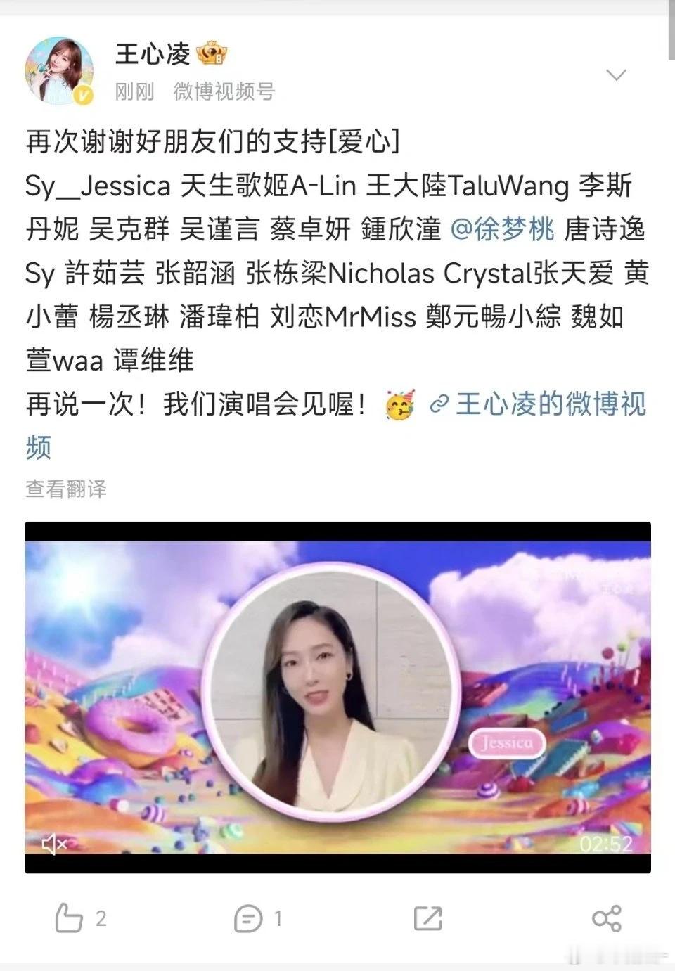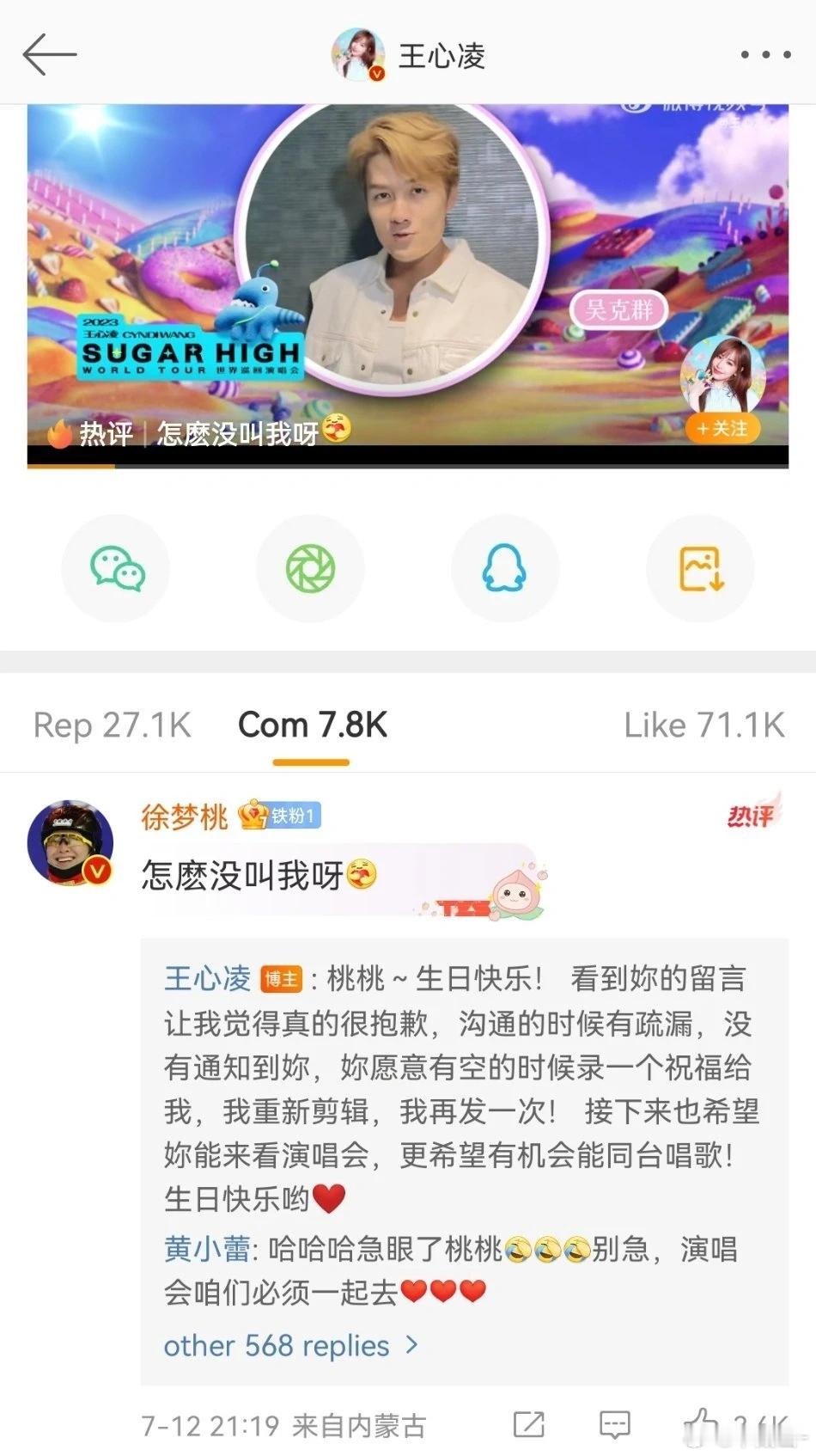 王心凌演唱会马上就要开始了,拍了一段朋友给的祝福!结果徐梦桃回复说怎么没有邀请她拍VCR。王心凌马上回复说:沟通的时候有疏漏,没有通知到妳,妳愿意有空的时候录一个祝福给我,我重新剪辑,我再发一次!