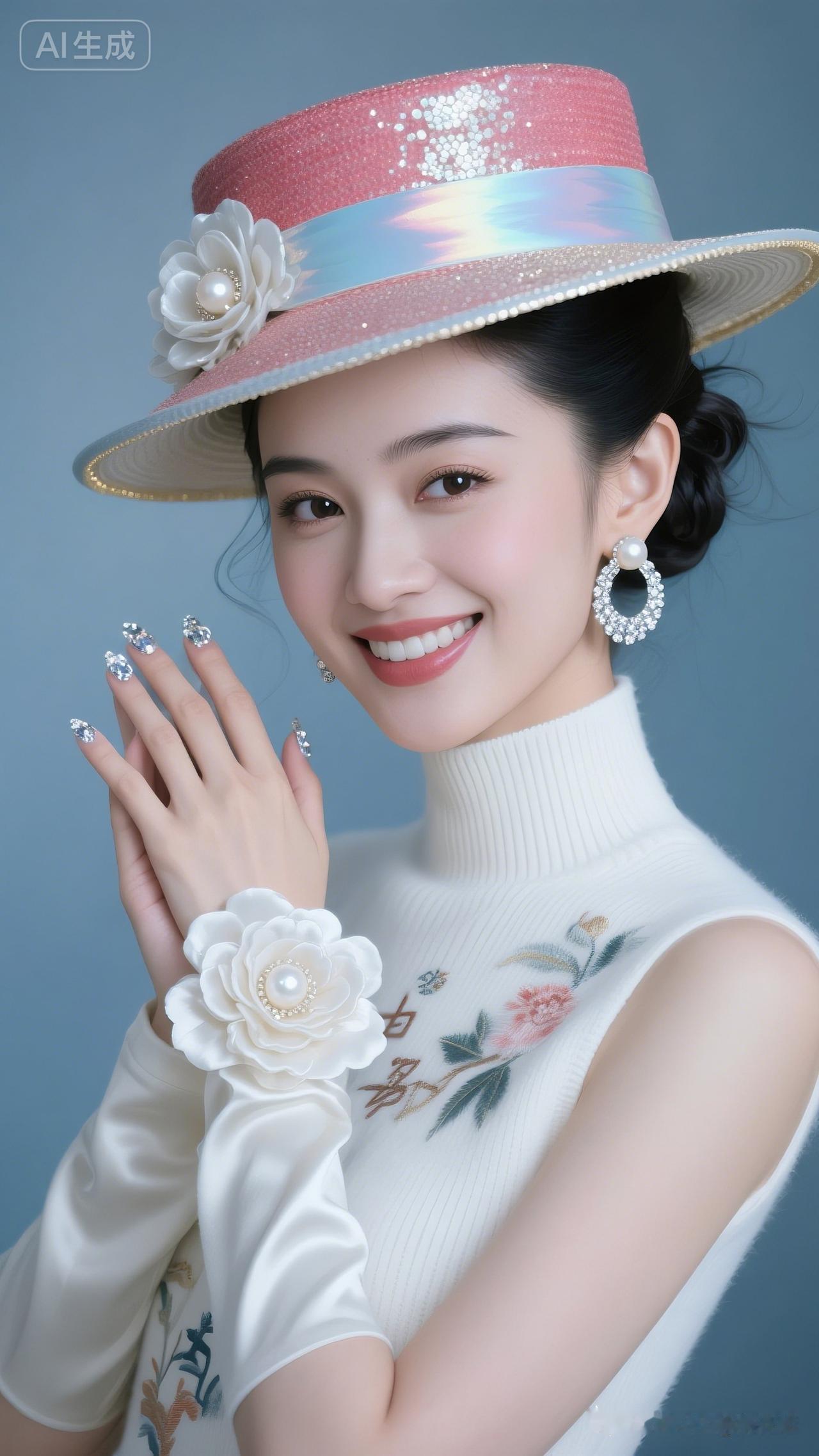 中景写实超清摄影,亚洲绝世美女笑靥如花,着奶白羊绒高定无袖衫,绣四大名绣,配桃红幻彩礼帽与钻石耳饰美甲。冷白皮水光肌,高盘发映柔光,雾霾蓝背景尽显清冷优雅,细节纤毫毕现。