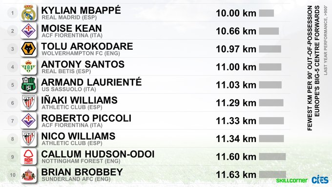虎扑02月22日讯CIES足球天文台盘点了本赛季五大联赛中锋球员中,每90分钟在球队不控球(防守)时跑动距离最少的是皇马前锋姆巴佩。