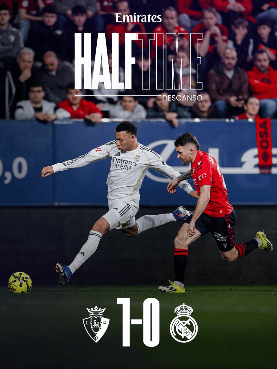 虎扑02月22日讯西甲第25轮,皇马客战奥萨苏纳,半场战罢,皇马0-1落后。
