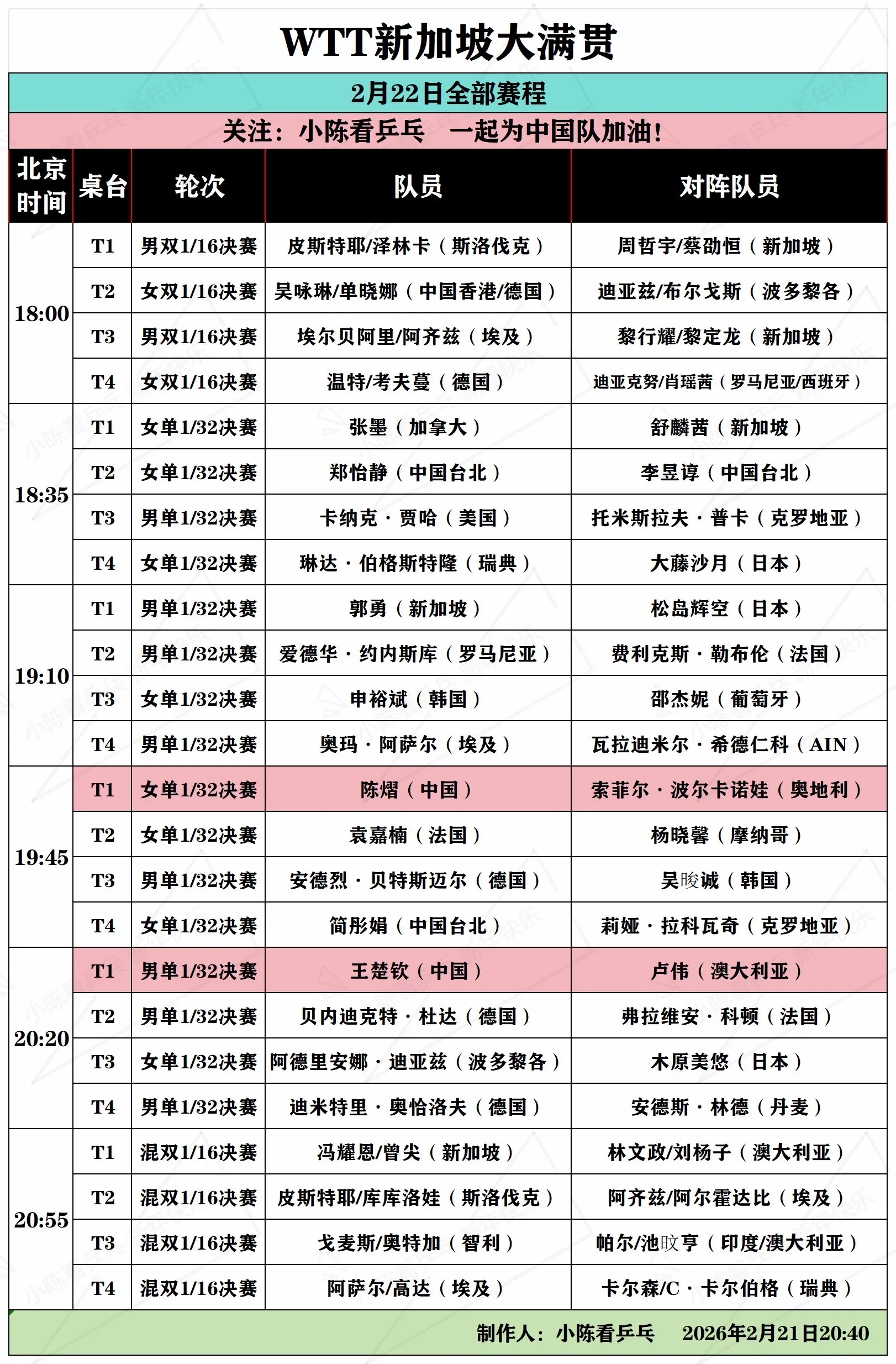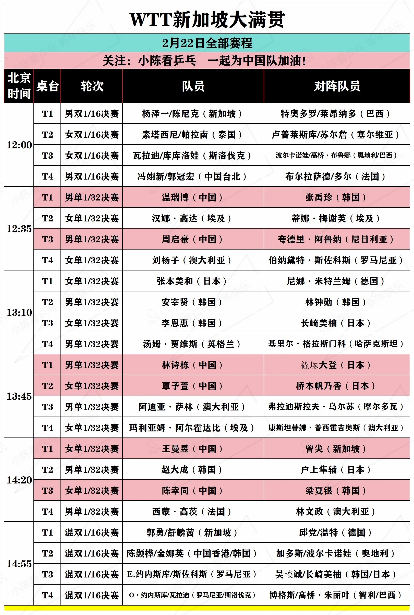 WTT新加坡大满贯2月22日赛程。WTT新加坡大满贯2月22日赛程,男女单打1/32决赛,双打1/16决赛,中国队双打首轮轮空,中国队加油。