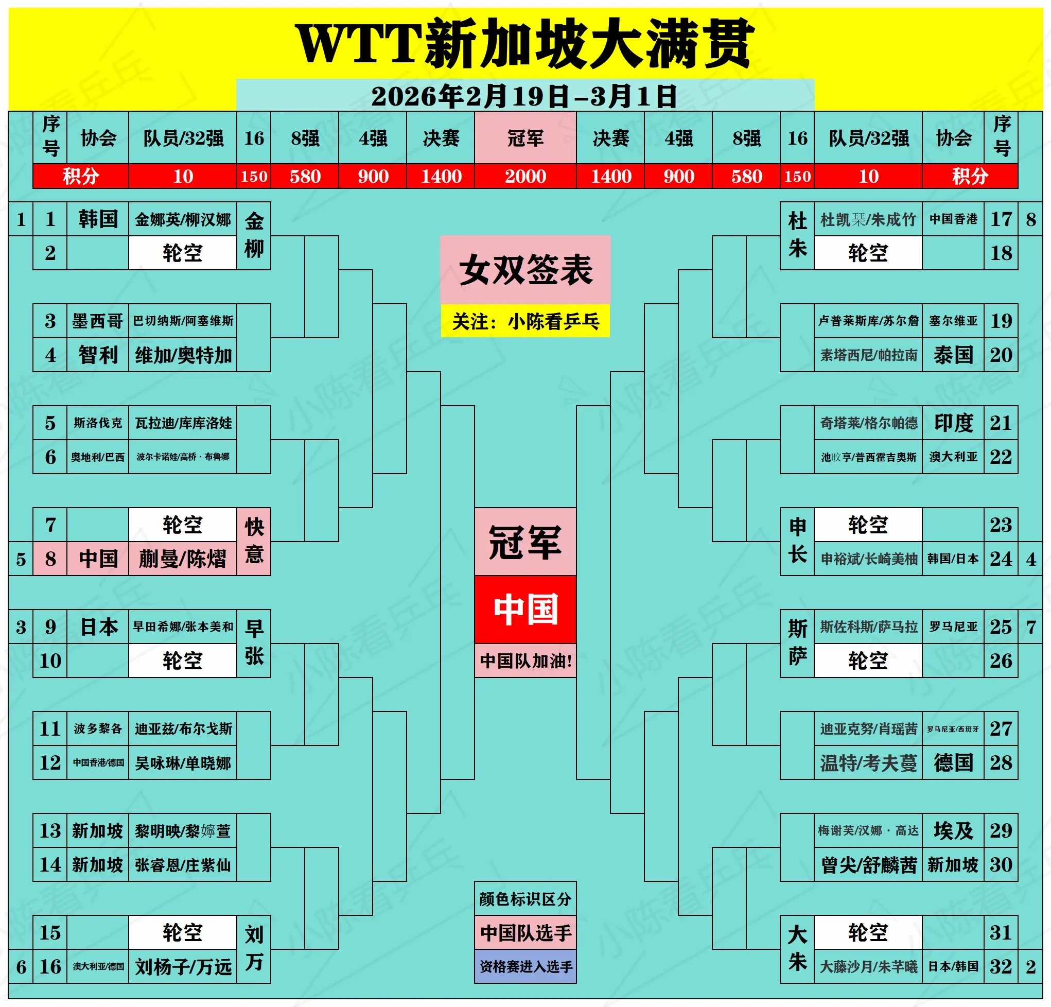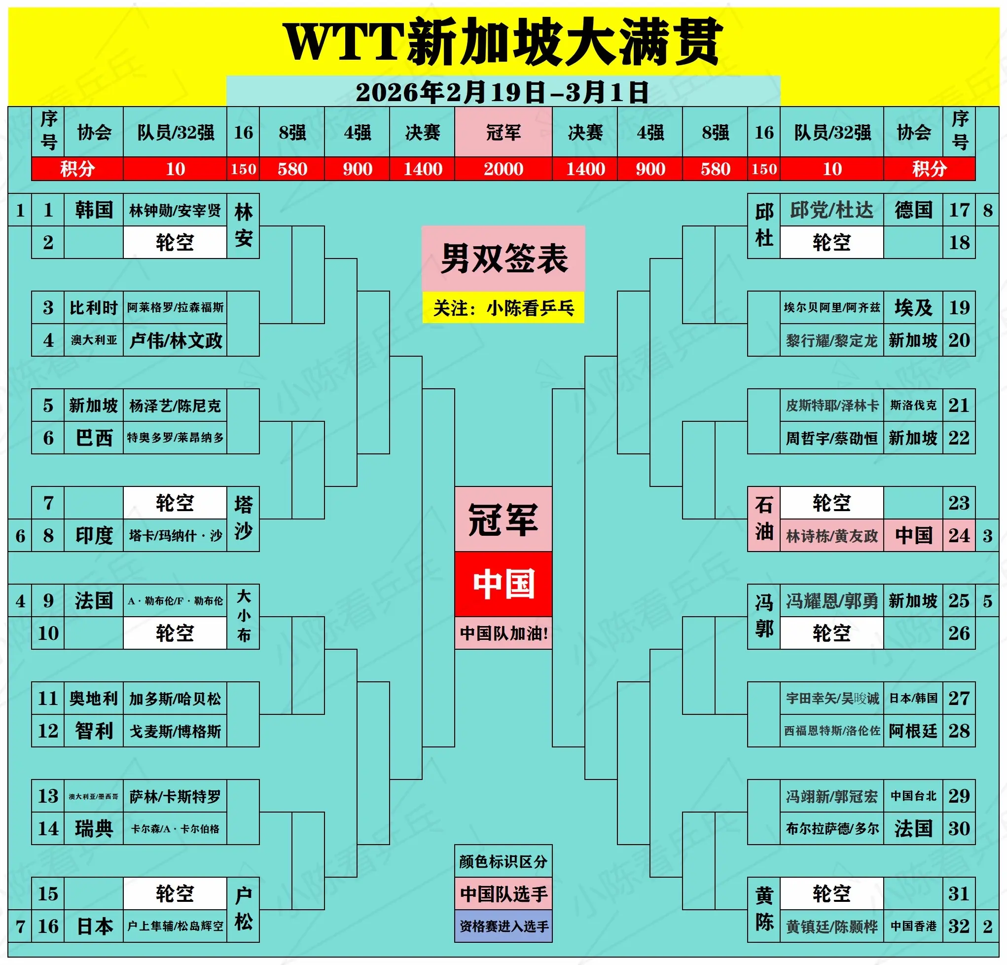 我真是开了眼了,没见过这么好的签位了[捂脸哭],2026WTT新加坡大满贯男双签