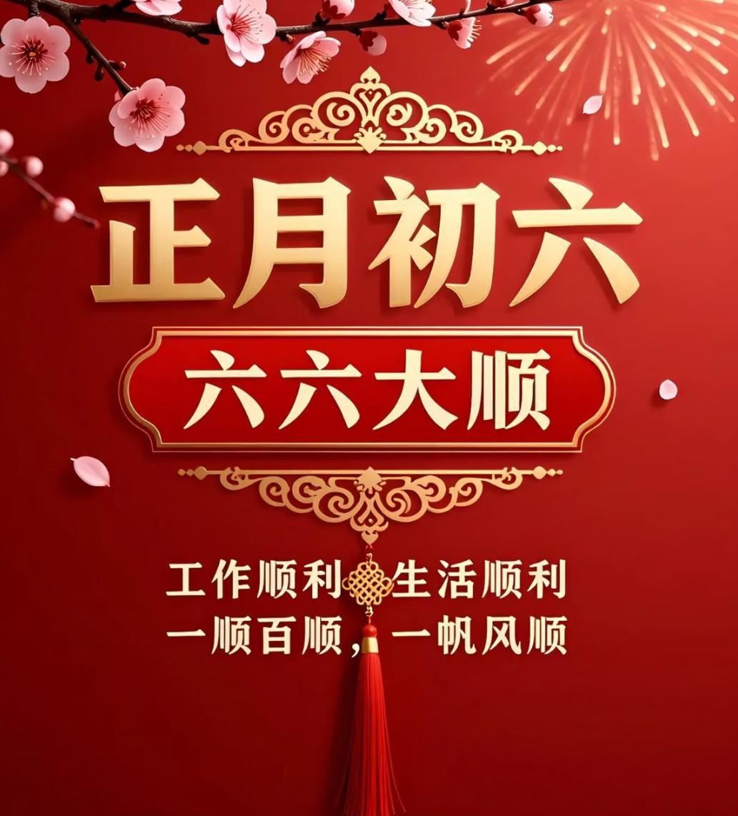 大年初六送祝福,六六大顺添富贵,万事亨通纳吉祥,一顺百顺好运来。传统文化 祝福