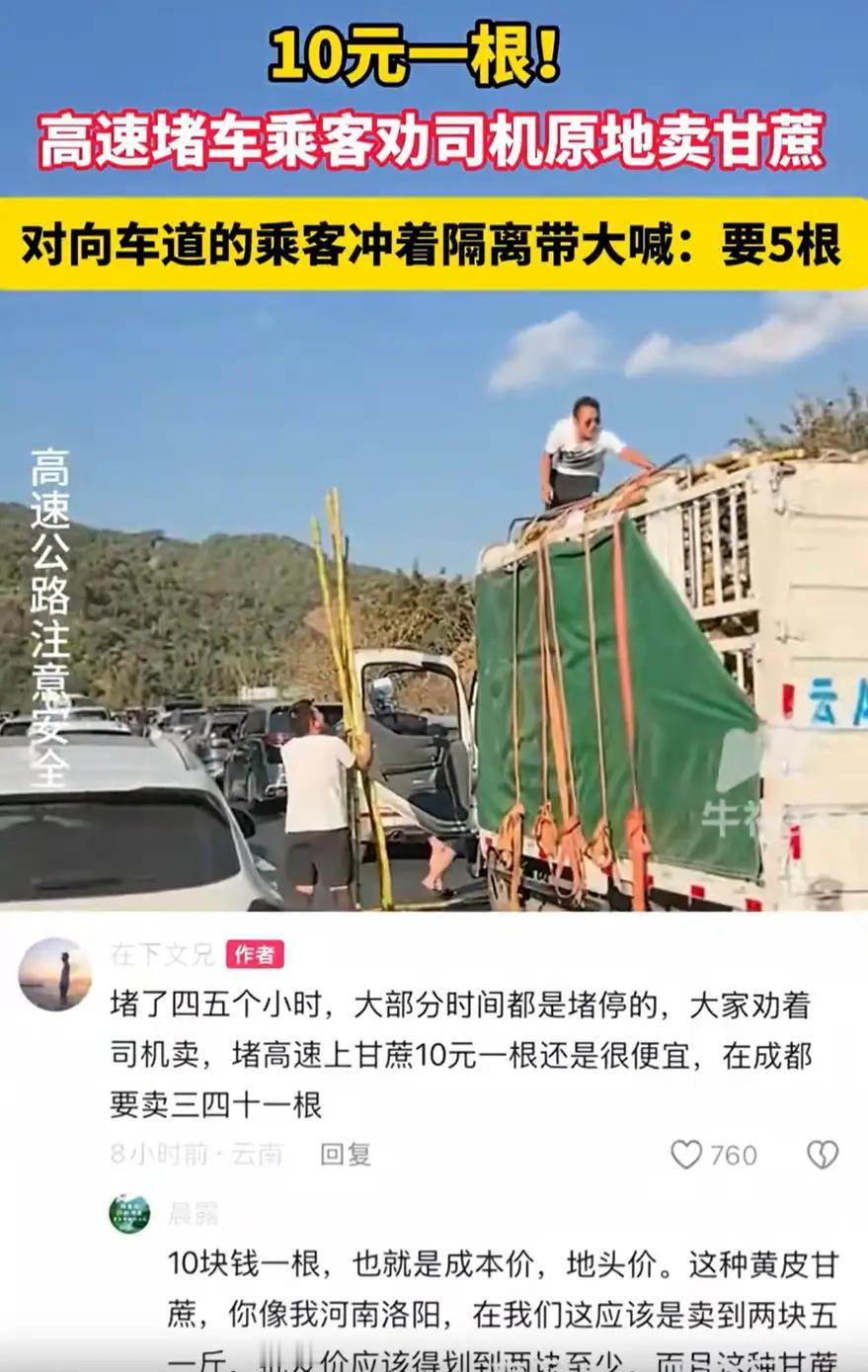 笑死了!云南墨江,一男子拉着一车的甘蔗上高速,没成想,赶上返程高峰期,直接堵在了高速上面,不少乘客干脆喊话男子直接在高速上面卖甘蔗,一根10块钱,生意好到不行。网友:司机怕是没想到,最好卖的地方在路上 云南墨江高速,返程的车流挤成了一条不动的长蛇。 几十公里路,硬生生变成了露天停车场,一堵就是四个钟头。 车里的人憋得难受,纷纷走下车,站在路边发呆、刷手机。 孩子们在应急车道上跑跳,大人们唉声叹气,只觉口干舌燥。 谁也没留意,车流里混着一辆货车,满满当当装的都是甘蔗。 车主本是要赶去市场,遇上这阵仗,只当是倒了大霉。 偏有路人渴得厉害,随口问了一句:师傅,甘蔗卖不卖? 车主一怔,说这路上,哪有做生意的道理。 路人笑答,十块钱一根,解解渴,你看可行。 车主点点头,抽下一根紫皮甘蔗递了过去。 就这一根,让周围的人全都醒了神。 堵了许久,嘴里发苦,瞧见新鲜多汁的甘蔗,谁能不动心。 扫码的、喊单的,不过片刻,货车旁就围了一圈人。 对向车道的人,隔着隔离带大声喊,要五根,快递过来。 一车甘蔗,竟在高速路上卖得热火朝天。 网友都说,十块钱一根,实在划算。 城里超市,一根少说十五二十,这价称得上良心。 我倒觉得,这算不上什么精明生意,只是一场凑巧的相逢。 平日里的买卖,有渠道,有定价,有层层算计。 可在堵死的高速上,一切都回到了最简单的模样。 你恰好有,我恰好要,没有多余的弯弯绕绕。 车主大概也没想到,最糟的堵车,成了最好的销路。 人生的事,大抵如此。 你以为是走投无路的倒霉,转头就成了意想不到的惊喜。 不必刻意谋划,不必强求结果,时机到了,自然顺理成章。 这人间的小热闹,总在最寻常的地方,藏着最实在的温暖。