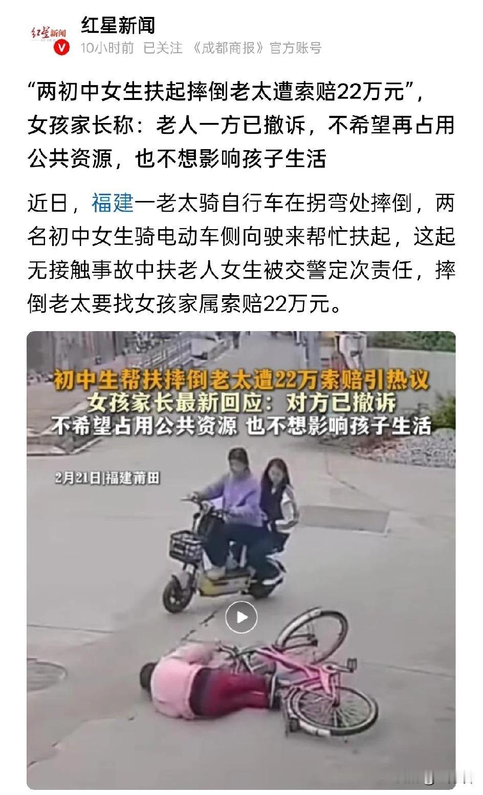 两初中生扶起摔倒老太,遭索赔 22 万。案件有了最新进展,据报道,老太已经撤回起