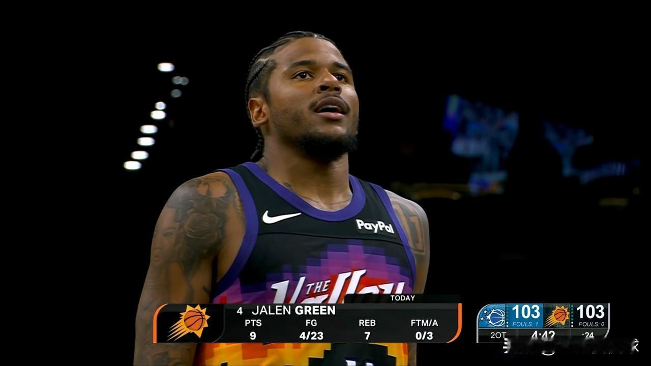 太阳超级巨星杰伦-格林真是让人爱恨交加!在今天太阳主场以113:110险胜魔术的比赛中,杰伦-格林的投篮手感非常的糟糕,然而他却在第二个加时赛的最后时刻命中了一记三分压哨绝杀,成为了球队的英雄。 全场比赛下来,杰伦-格林首发出战36分钟,投篮26中6,其中三分球11中2、罚球6中2非常低效的得到16分,还有7篮板5助攻3抢断。 坦白说,当我看到杰伦-格林在场上频频的投篮打铁时,我真是怒火中烧;然而当我看到他投进了一记三分压哨绝杀时,我对他的喜欢瞬间到了顶点。
