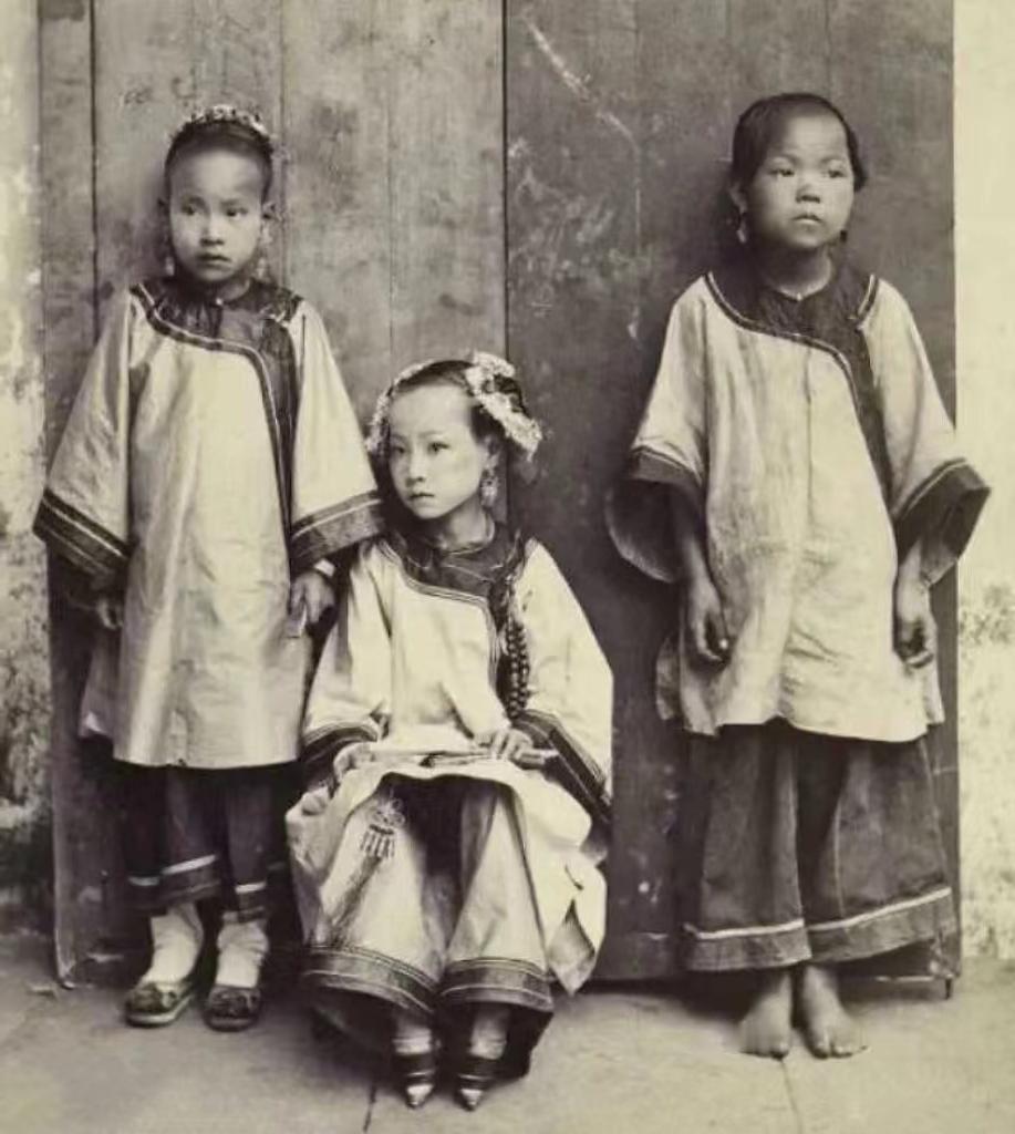 1907年,武昌,中间端坐的小女孩,是一位家境优渥的千金小姐,她身着华服、头戴珠饰,一双“三寸金莲”是她身份的象征,也是封建礼教的枷锁。而站在她身后的两个女孩,则是她的丫鬟,她们的衣着、发型,尤其是那双未经束缚的脚,清晰地划分了主仆之间无法逾越的鸿沟。 右侧站立者是粗使丫鬟。她的衣着最为破旧,甚至赤着双脚,这说明她主要从事体力劳动,在主仆等级中处于最底层。左侧站立者应该是贴身丫鬟。她的衣着比粗使丫鬟稍好,也做了简单的打扮,脚上穿着鞋袜,表明她主要负责照顾小姐的起居,属于“有头有脸”的仆人。