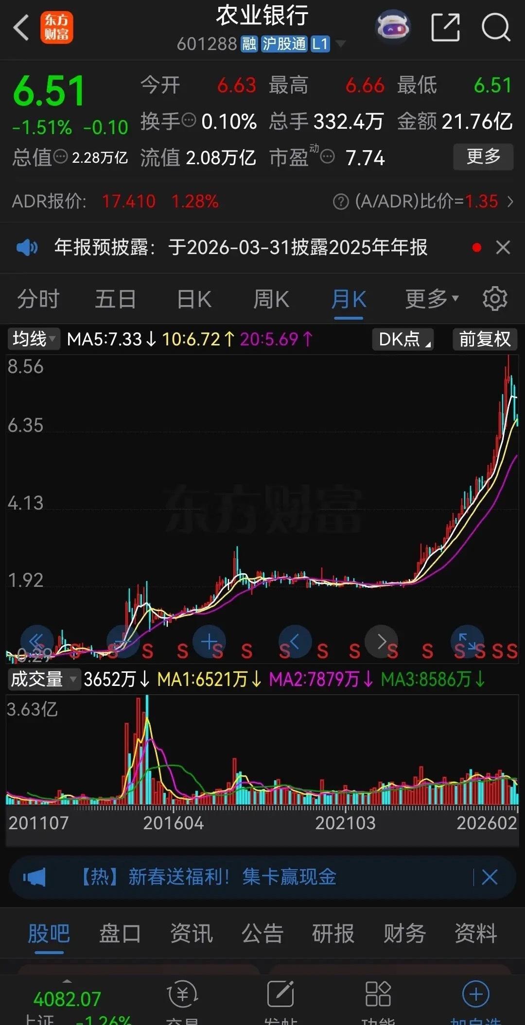 但农业银行自从去年11月份股价见顶后便开始一路下跌,节前最后一个交易日股价更是彻底跌破各条均线,处于空头态势。不光农业银行,包括六大行,股份制银行,城商行等都在走下降趋势,可以说银行股已经提前走完了牛市,完成了历史使命。