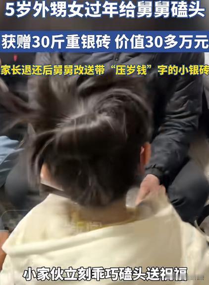 山东临沂,男子醉酒后逗5岁外甥女,称磕头就给块重30斤、价值30多万的银砖。外甥女不懂价值,磕头后舅舅当场送出。第二天家长觉得礼物太贵重,主动归还。舅舅理解后,重新送了块刻有“压岁钱”、价值1000多元的小银砖。网友热议:如果舅舅酒醒后反悔,能否要回银砖呢? 过年,大家都图个乐呵,有个男子喝了不少酒,整个人晕乎乎的。这时候,他看到自家5岁的外甥女,那小模样可爱极了,就起了逗孩子的心思。 男子跟外甥女说:乖孩子,你给舅舅磕个头,舅舅就给你一块大银砖。 外甥女哪知道这银砖有多值钱,在她眼里,可能就是舅舅手里一个好玩的玩意。她也没多想,立马就规规矩矩地磕了个头。 舅舅当时喝得高兴,脑子一热,还真就把那块重达30斤、价值30多万的银砖给了外甥女。那场面,外甥女抱着银砖,眼睛亮晶晶的,舅舅在一旁笑得合不拢嘴。 可第二天,孩子家长知道了这事,这30多万的银砖,他们觉得这礼物太贵重了,收下心里实在不踏实。万一以后有个什么事,这多麻烦。于是,家长就带着孩子,主动把银砖还给了舅舅。 舅舅也挺通情达理的,他理解家长的顾虑,觉得也是这么个理。毕竟这么贵重的东西,给这么小的孩子,确实不合适。 于是,他又重新准备了一块小银砖,上面还刻着“压岁钱”三个字,这小银砖价值1000多元。舅舅把小银砖给了外甥女,外甥女还是很高兴,在她看来,只要是舅舅给的,都是好东西。 这事传到网上后,有的网友说:要是舅舅酒醒后反悔了,能不能把这银砖要回去呢? 从法律角度来说,舅舅在醉酒状态下,把价值30多万的银砖给了外甥女。 根据《民法典》规定,行为人具有相应的民事行为能力是民事法律行为有效的条件之一。舅舅当时醉酒,可能意识不太清醒,这种情况下做出的赠与行为,效力是存在疑问的。 不过,第二天家长把银砖还回去了,这事儿也就没闹大。要是舅舅酒醒后反悔,想要回银砖,那情况就复杂了。 如果舅舅能证明自己当时是醉酒状态,意识不清,赠与行为不是自己的真实意思表示,那有可能可以要回银砖。 但要是舅舅拿不出证据,或者外甥女这边有证据证明舅舅当时是自愿赠与的,那舅舅想要回银砖可就难了。 后来舅舅重新送的小银砖,这就属于正常的赠与行为了。舅舅有民事行为能力,自愿把小银砖送给外甥女,外甥女也接受了,这赠与行为就是有效的,不存在要回去的问题。 其实,舅舅一开始逗外甥女,是出于对孩子的喜爱,家长还回银砖,是觉得不能占这个便宜,舅舅后来又送小银砖,也是不想让孩子失望。这一来一往之间,都是浓浓的亲情。 要是舅舅一开始就考虑清楚,不因为醉酒就随便许下这么贵重的承诺,也就不会有后面这些事了。不过话说回来,谁还没个冲动的时候呢,好在最后大家都能互相理解,把问题解决了。 亲情这东西,不能用金钱来衡量。要是舅舅和外甥女之间因为这块银砖闹得不愉快,那多不值当。 要是你们遇到这种情况,会怎么处理呢?快来评论区说说你们的看法吧,一起聊聊这亲情和金钱的事。 说不定你们的经历和想法,能给其他人一些启发呢。亲情永远是最重要的,可别让金钱把这份美好的感情给破坏了。你们说是不是这个理呢?