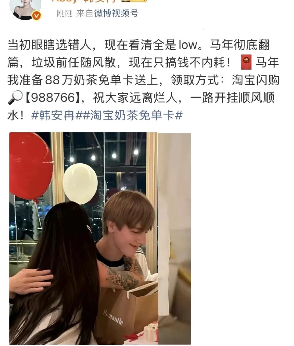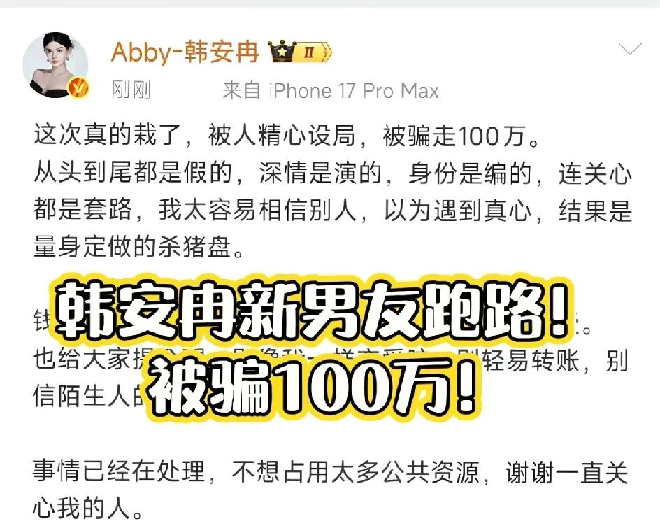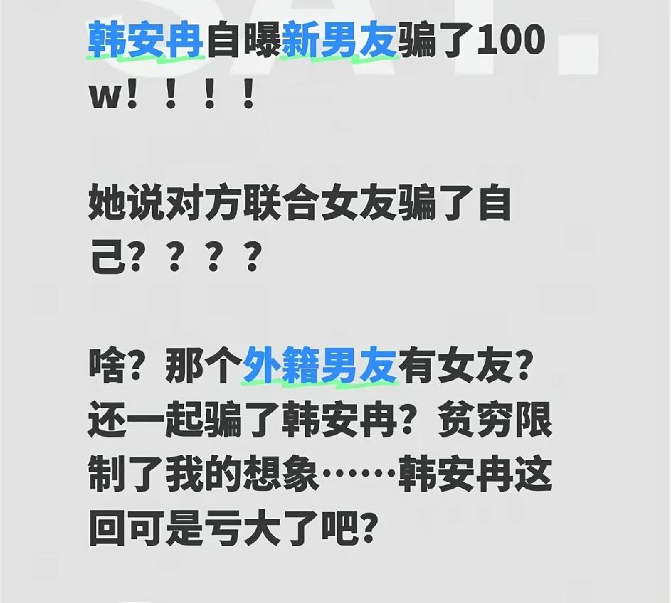 韩安冉真的太搞笑了。外国男友居然是杀猪盘,骗了她100万。年前还在秀恩爱,说找到了一个俄罗斯男友,说这次遇到真爱,还说爱人的眼是第八大海洋。说的那么深情。才几天呢?就报警了,所谓的外国男友有正牌女友。对方就是一个主播,骗她刷礼物刷了六七十万,当面送了10万的礼物。还一起出去玩消费,总共见了世面,拥抱了四次。而且外国男友还自称自己的女友是弟弟的女友,还让韩安冉给他的女友刷礼物,买护肤品,买苹果17。网上都在呼吁封杀韩安冉,负面新闻太多了,一波接一波,吃瓜吃的没完没了。