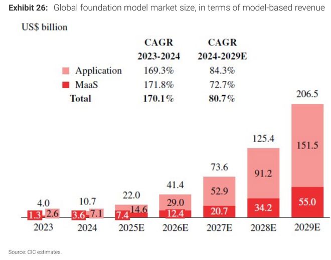 在全球基础模型市场规模预计从2024年的107亿美元增长至2029年的2065亿美元(CAGR80.7%)的背景下,公司当前全球市场份额仅约0.3%。只要份额小幅提升,收入弹性就会显现。
