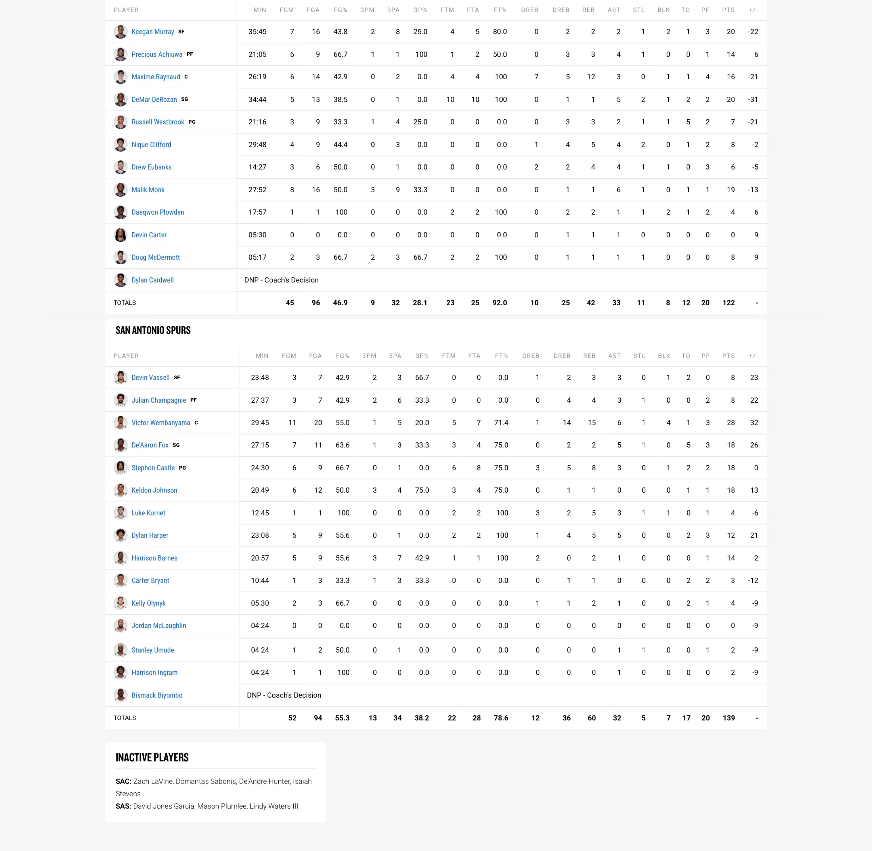 国王(12-46):穆雷20分2板2助2帽、德罗赞20分1板5助2断、蒙克19分1板6助、雷诺16分12板3助、阿丘瓦14分4板4助、克利福德8分5板4助2断、麦克德莫特8分1板1助、威斯布鲁克7分3板2助、尤班克斯6分4板4助、普洛登4分2板1助2帽、卡特1板1助