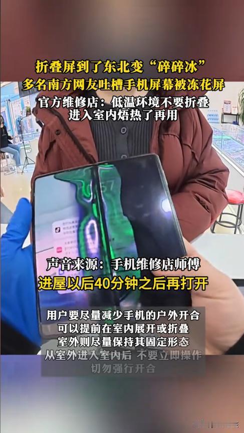 “哭笑不得!”近日,一男子到东北旅游,竟发现自己的折叠屏手机被冻出“极光色”,屏幕甚至像“雪糕脆皮”一样脆弱,一折就裂,简直成了“碎冰冰”,而很多人也都出现了同样的情况。网友:折叠屏手机在东北销量不好吧? 东北的冬天,气温动辄低至零下二三十摄氏度,而这对于普通的电子产品来说是一个巨大考验。 据媒体1月27日报道,男子去东北游玩时,将自己的折叠手机放在了兜里,没过多久,几人就去店里买东西,付款时才发现自己手机的折叠屏变色了,出现诡异的“极光色”纹路,不仅影响显示,还变得格外脆弱,轻轻一折就出现裂痕,甚至直接“碎屏”,维修费动辄上千元。 维修店工作人员表示,折叠屏手机的屏幕多为柔性材质,低温会让柔性屏的柔韧性大幅下降,变得又脆又硬,不仅容易出现变色、触控失灵,还极易在折叠时发生碎裂,已经有很多人中招了。 男子顿时感觉哭笑不得,于是将这段经历发到了网上,没想到竟引来很多网友的共鸣。很多网友纷纷晒出自己被冻坏的折叠屏,屏幕上的“极光色”纹路清晰可见。 专业人士提醒,在东北等低温地区,尽量避免在0℃以下的户外长时间使用折叠屏手机,使用时可放在口袋、包里保温,减少低温损伤。 信息来源:《折叠屏到了东北变“碎碎冰”,“手机被冻坏一打开屏幕就变极光色”,官方维修店:低温环境不要折叠,进入室内焐热了再用》潮新闻