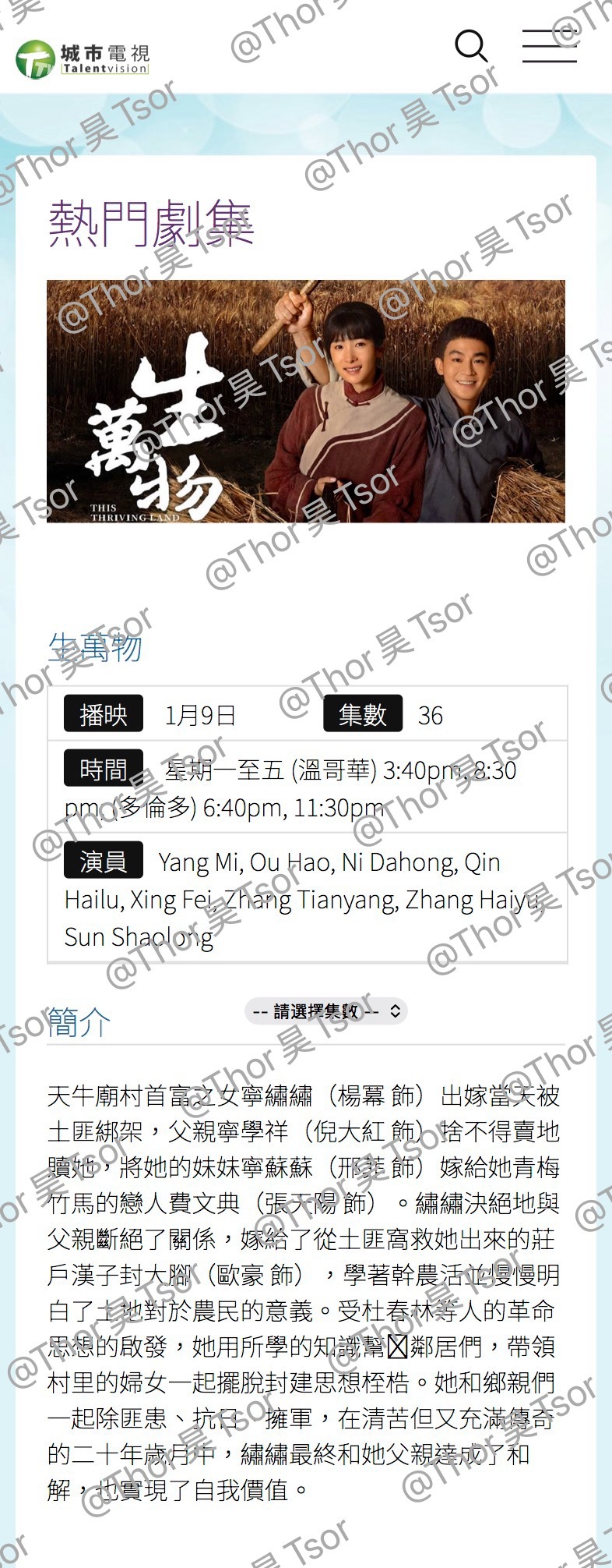【生万物加拿大播出生万物美国播出 】杨幂、欧豪领衔主演,倪大红、秦海璐、邢菲、张天阳、张海宇、孙绍龙主演的36集热土生长群像剧《生万物 》已于01月09日加拿大城市电视频道播出,已于02月03日美国KTSF26频道播出。