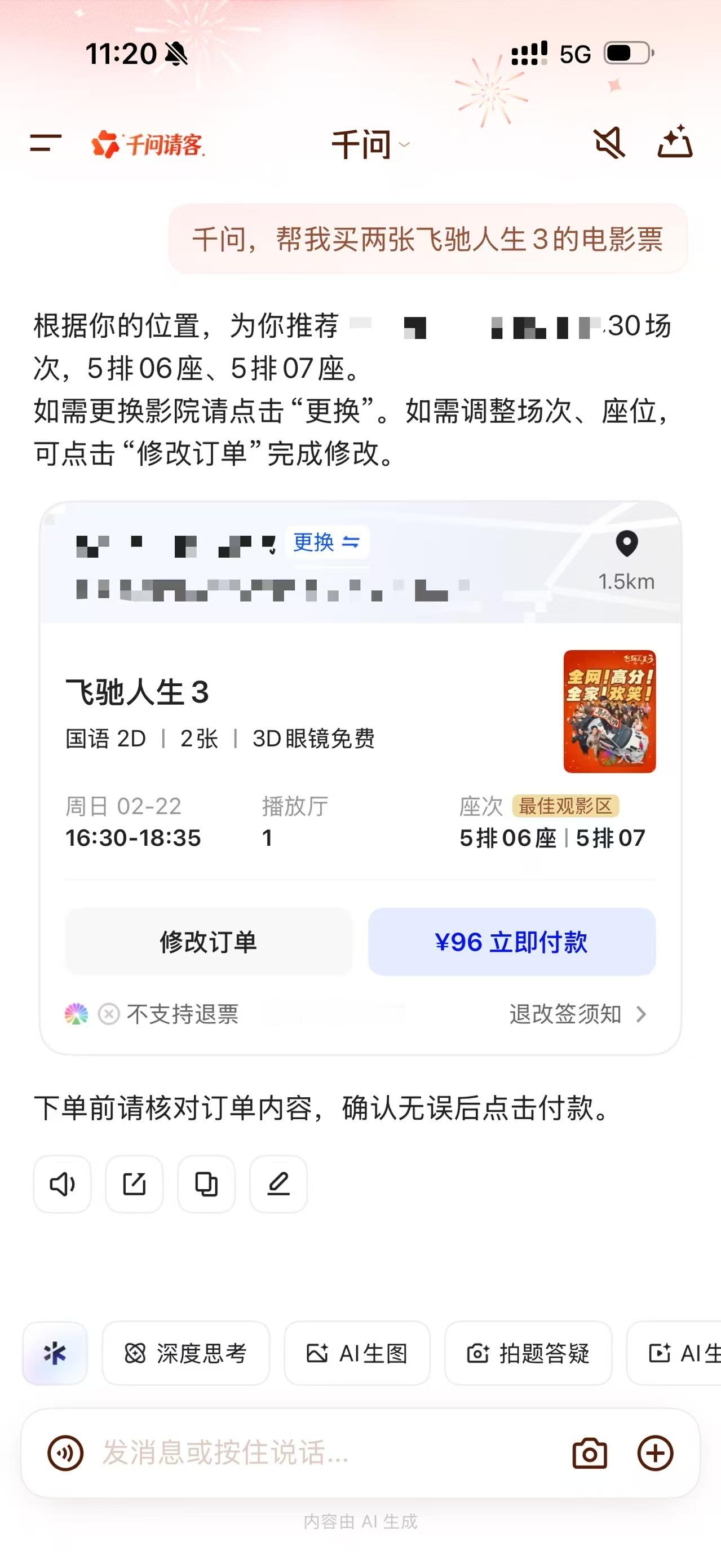 本来是薅羊毛下的千问,结果这段时间用下来,我真心觉得千问太懂大家的生活了!春节期间不管是出门旅行订机票酒店,还是在家点外卖、买百货,一句话就能安排得明明白白。而且我囤的这些免单卡福利也超实在,覆盖吃喝玩乐方方面面,用起来幸福感直接拉满。