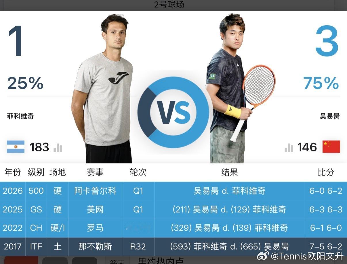 🔵ATP500阿卡普尔科男单资格赛首轮✅🇨🇳吴易昺6-0/6-2送蛋横扫🇦🇷菲科维奇晋级资格赛决胜轮交手记录来到3-1