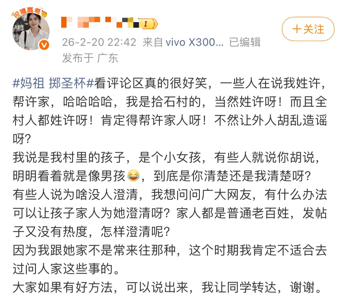 妈祖换人有自称是妈祖事件同村村民的网友发声称,所谓的耀祖也是个小女孩。这就很尴尬