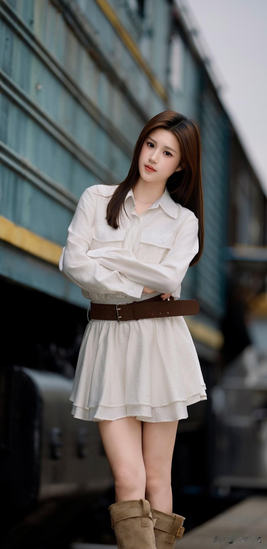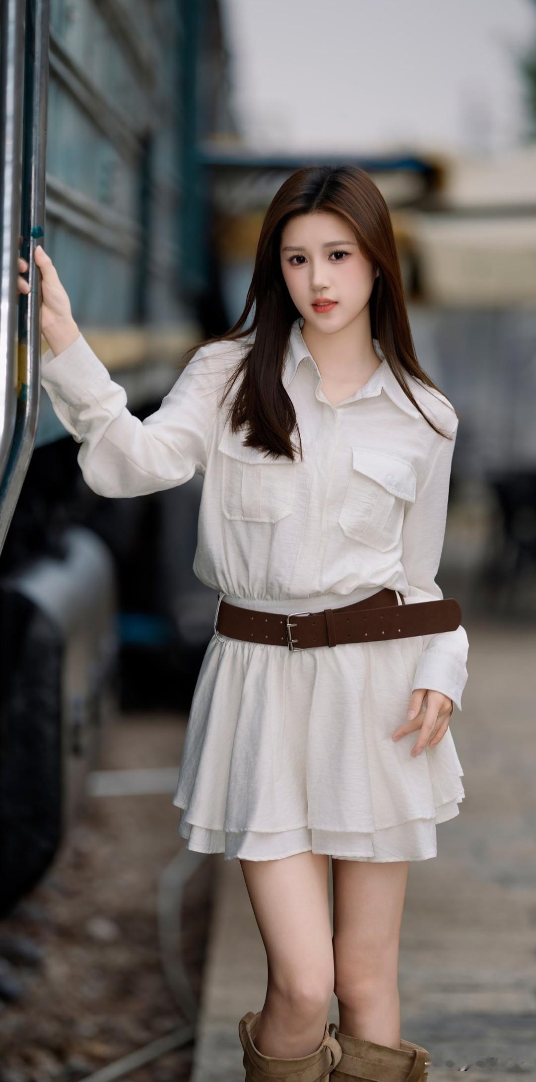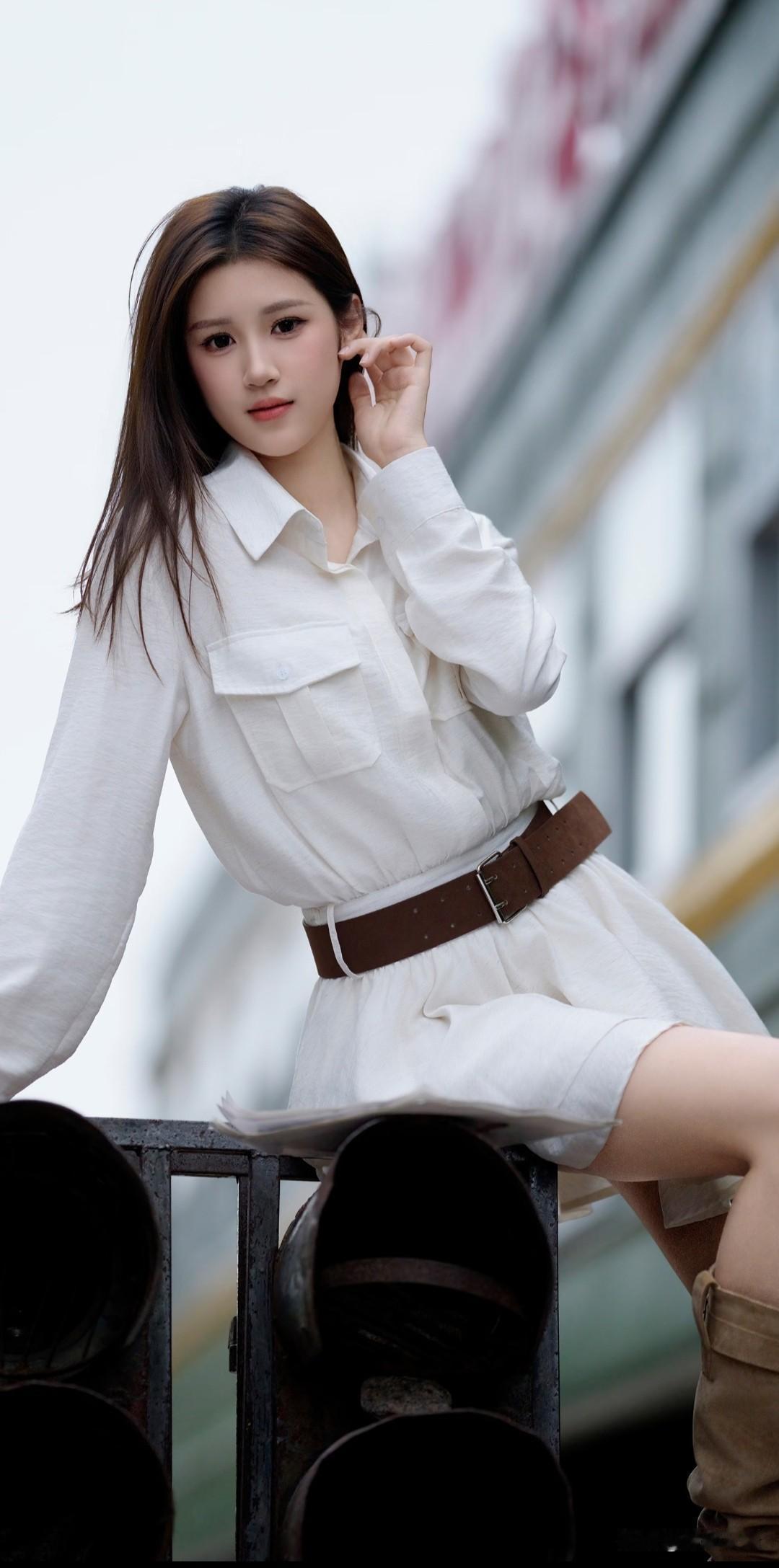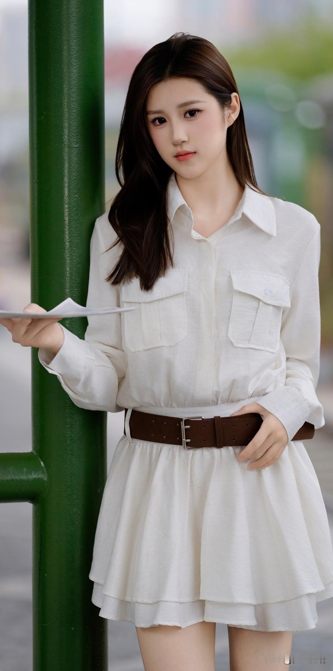 清新少女风,白色衬衫裙搭配棕色腰带,简约时尚!