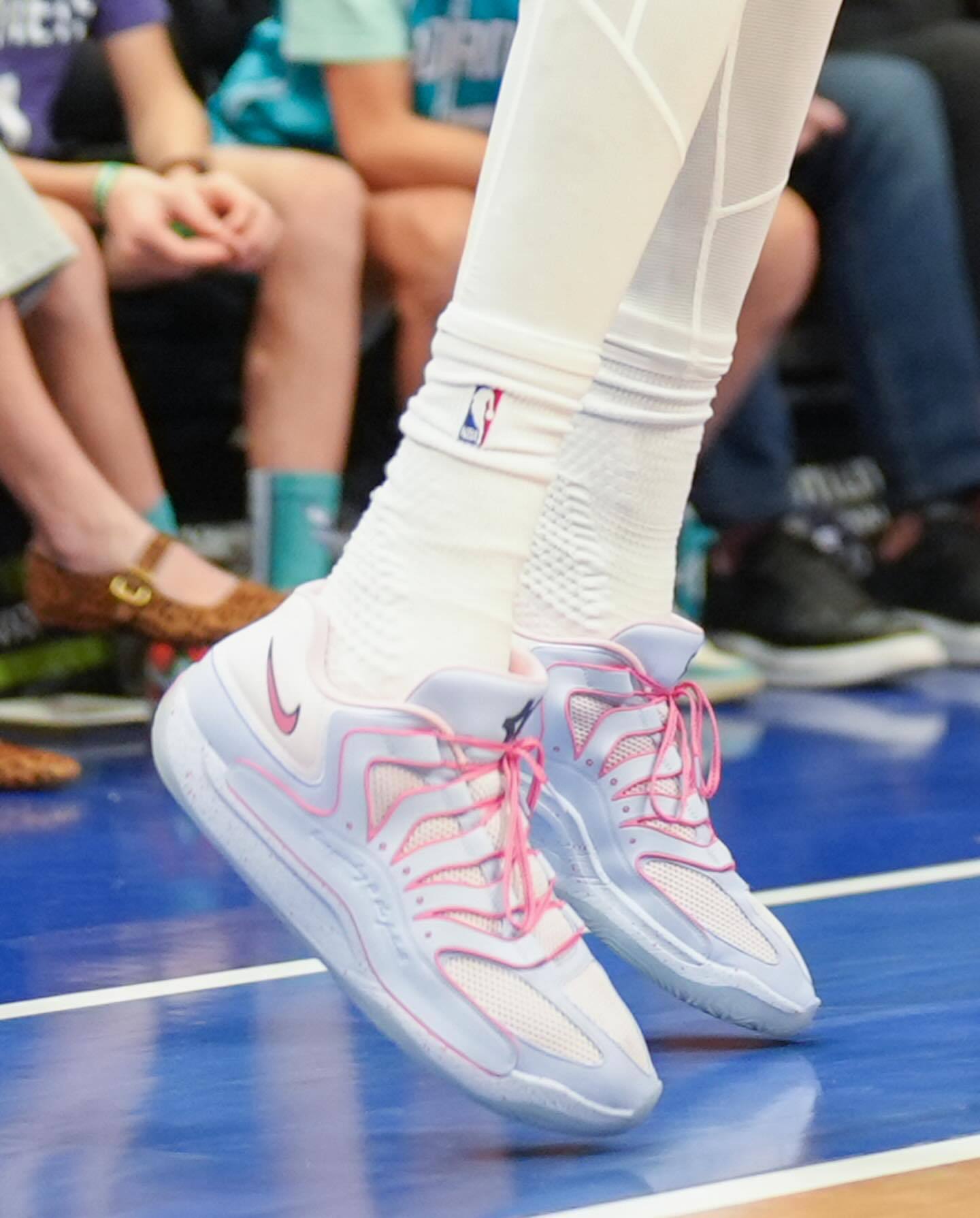 杜兰特穿着的这双 Nike KD 18 PE 有些特别——鞋款设计出自华盛顿红皮队传奇安全卫肖恩·泰勒的女儿杰基之手。2007年,泰勒在佛罗里达的家中遭遇入室抢劫不幸中枪离世,年仅24岁。如今,他的女儿用这样的方式延续父亲的印记,让这双鞋承载的意义远不止于配色本身。